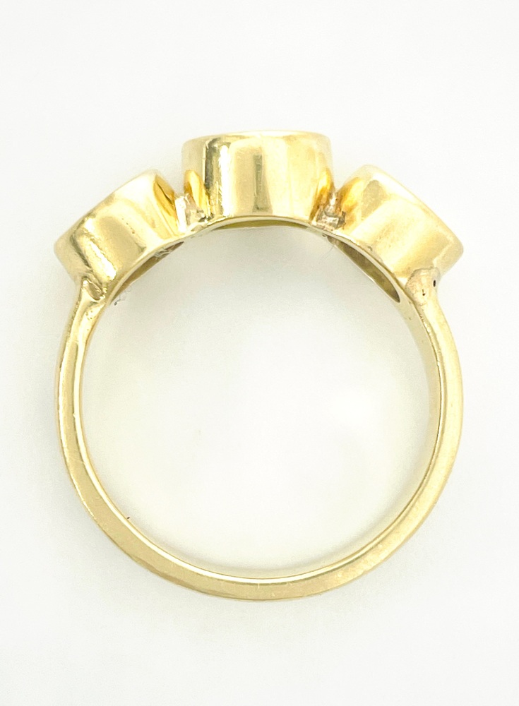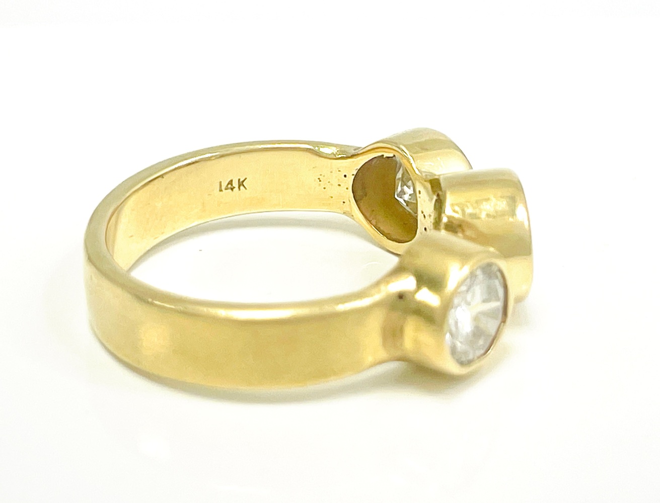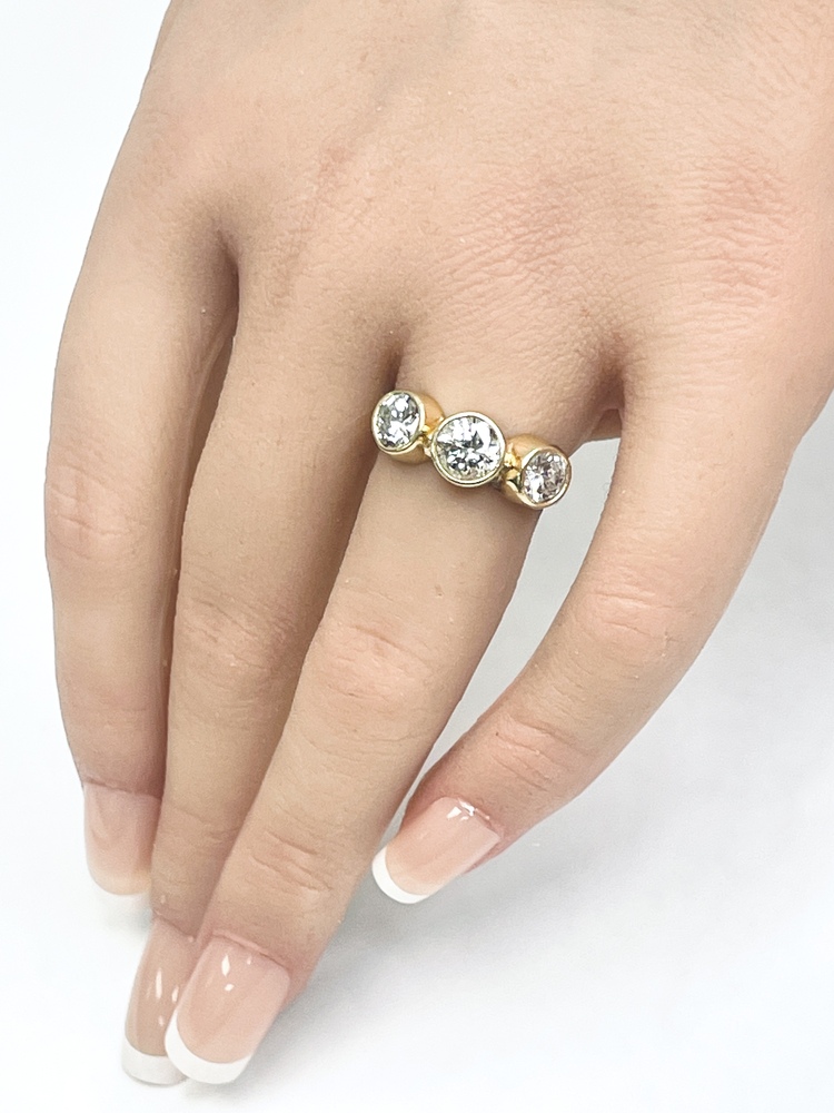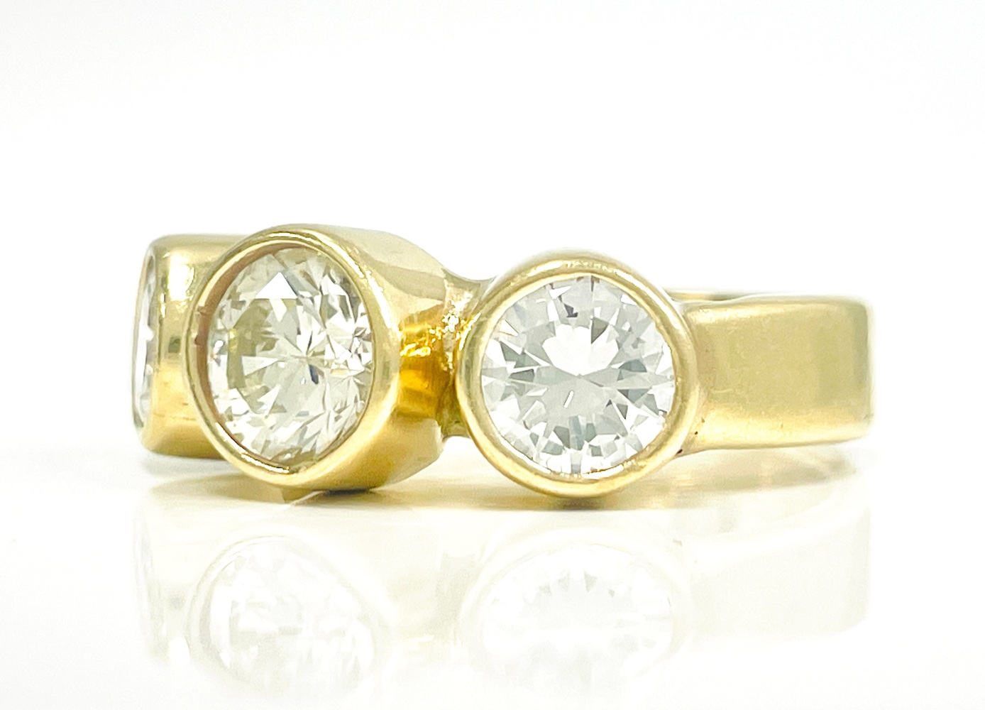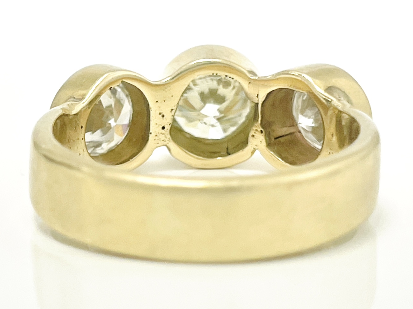 Exquisite 14K Yellow Gold Three-Stone Diamond Ring, expertly crafted with a stunning .80 ctw Round Natural Diamond. Encrusted with 2 brilliantly cut, .60 ctw each, approx. 5.4mm. All diamonds are SI2-Near Colorless, 2.00 total carat weight.
