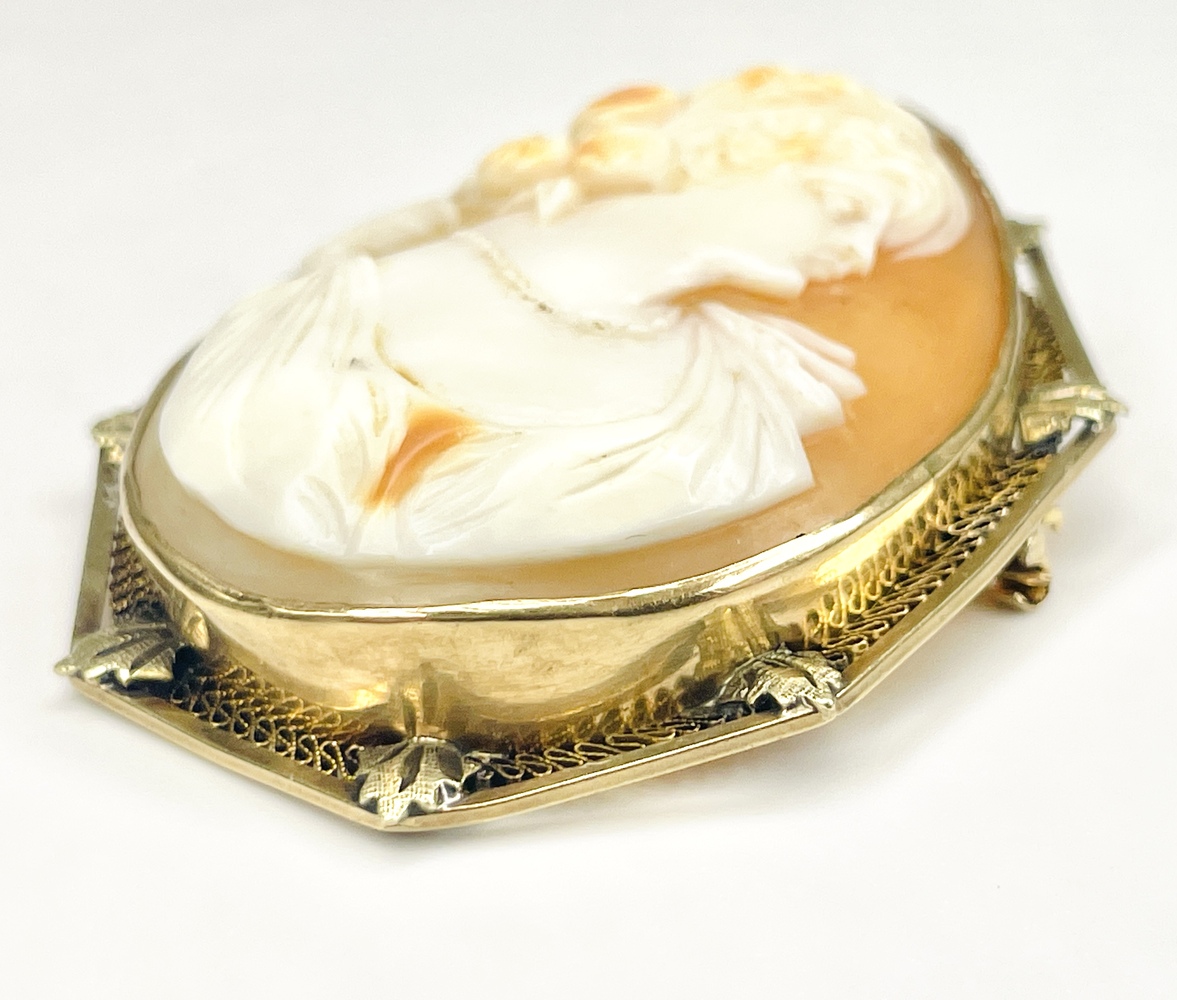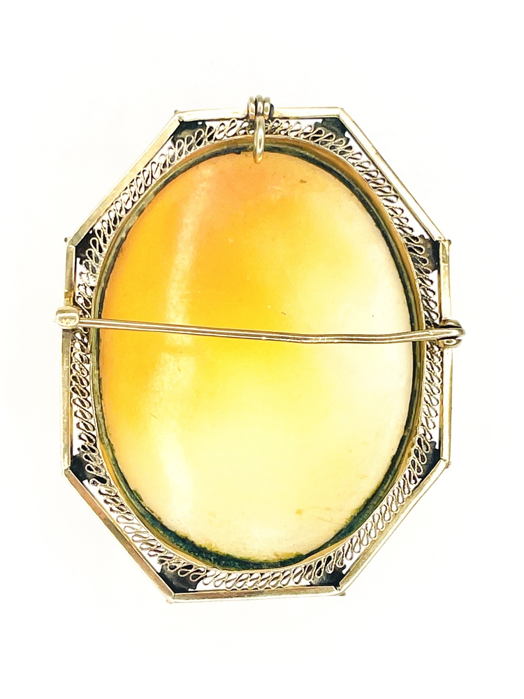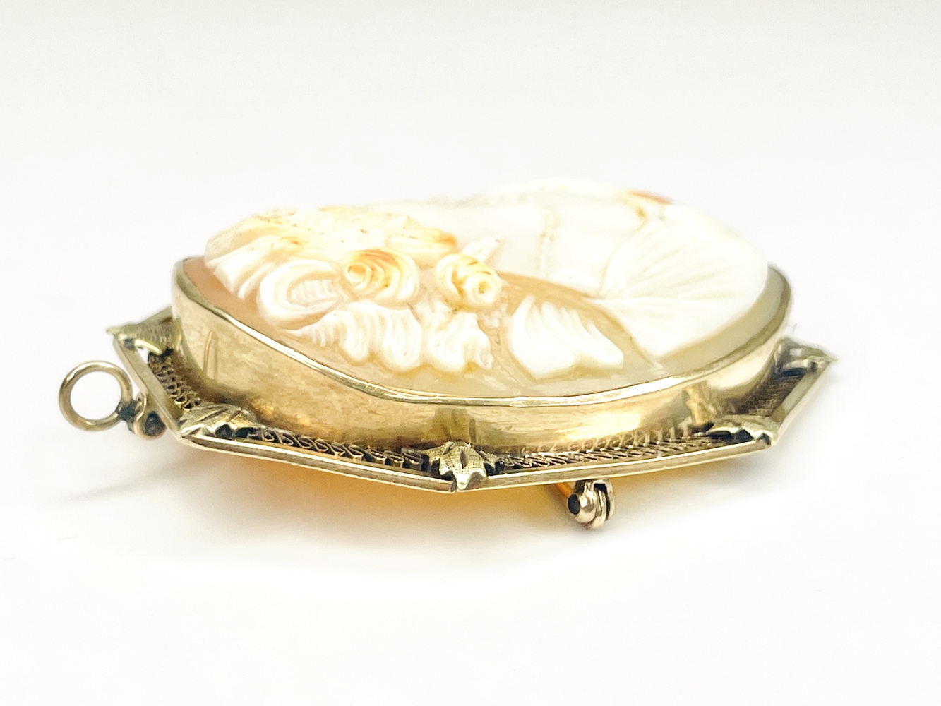 Experience the allure of timeless elegance with this 14K Two-Tone Cameo Brooch/Pendant. Expertly crafted and showcasing a charming hinged bail, its elegance is bound to captivate. Measuring approximately 1.75 inches, this versatile piece can be worn as a stunning brooch or a dainty pendant. An embodiment of sophistication and grandeur, it's a must-have for any jewelry collection. Add a touch of classic beauty to your ensemble with this exquisite piece.