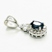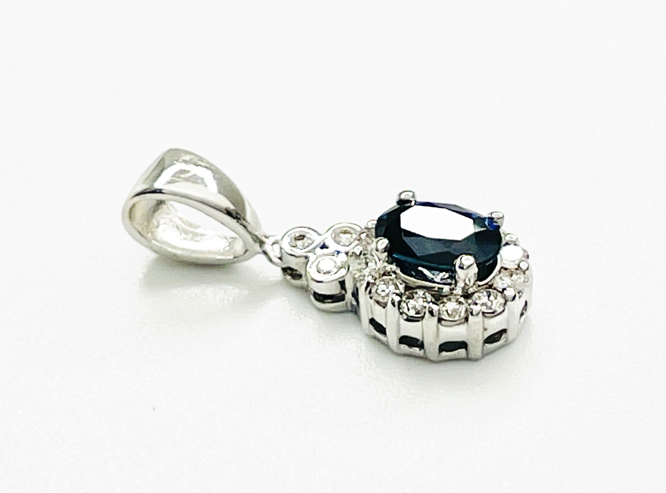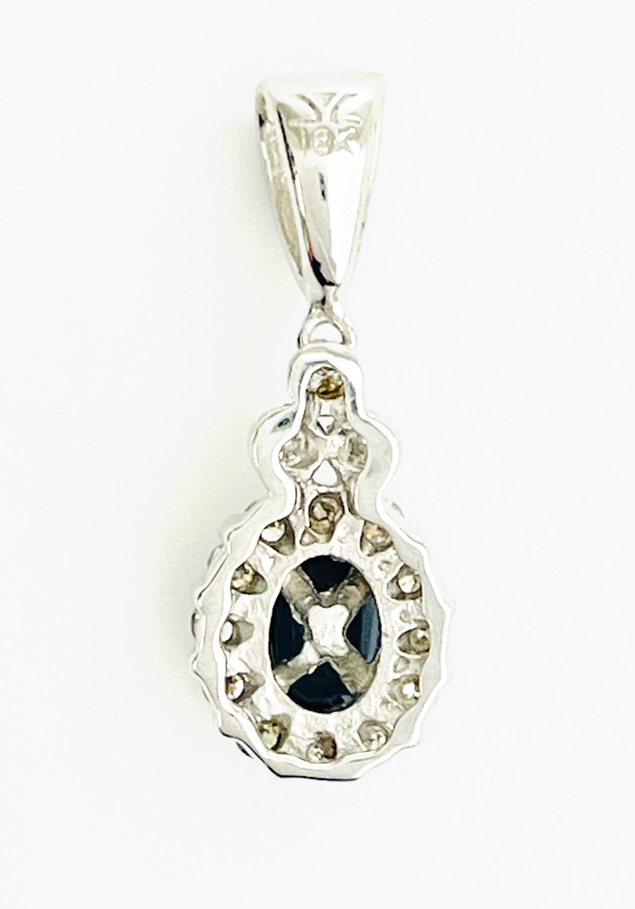 Adorn yourself with this exquisite 18K white gold pendant, centered by a mesmerizing oval Sapphire measuring 4 x 6 mm. This magnificent piece is surrounded by 15 lustrous, near-colorless natural round diamonds of approximately .25 ctw. Each stone represents unmatched quality with a clarity of VS. A tribute to elegance and sophistication, this stunning piece illustrates an unmatched merging of artistry and luxury.