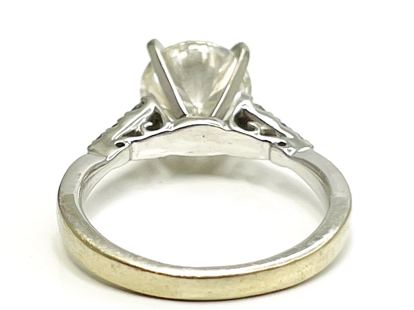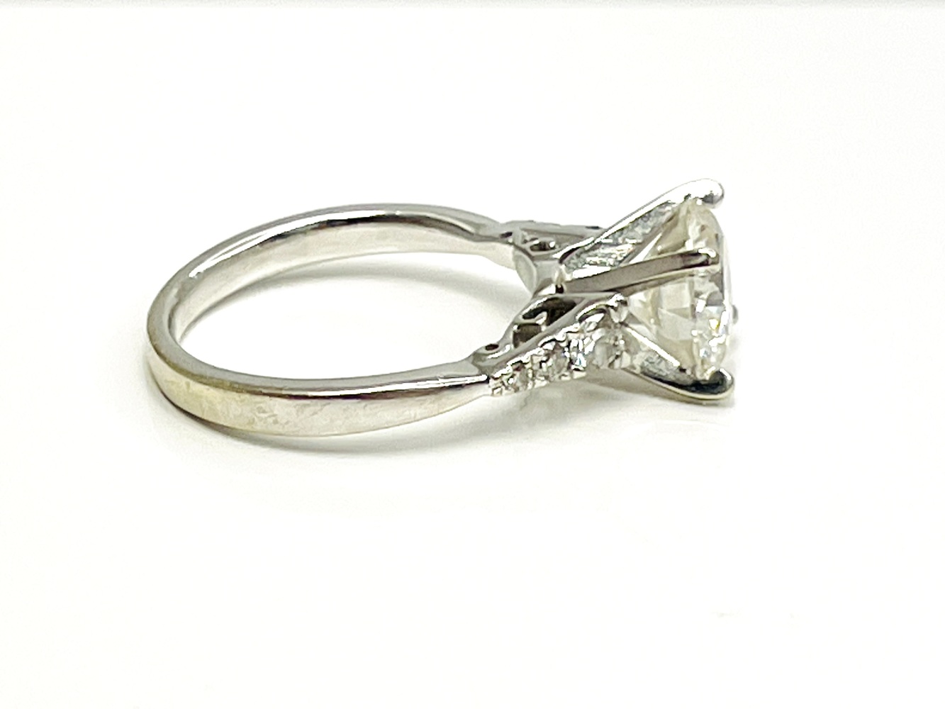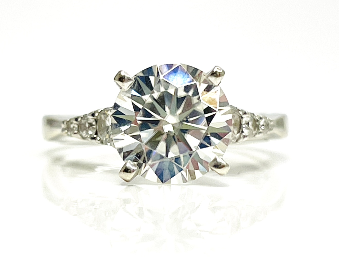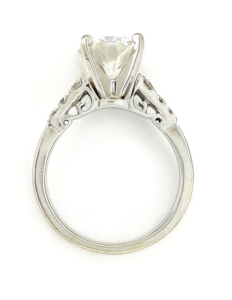 Adorn your finger with this exquisite 18K white gold Moissanite ring. Flaunting a shining Moissanite center of approximately 2.0 ctw, gracefully accented by six near colorless round diamonds of approximately .15 ctw, with SI1 clarity. Exuding elegance and timeless sophistication, this captivating art piece is tailor made for finger size 5. Celebrate precious moments with this lavish symbol of eternal beauty.