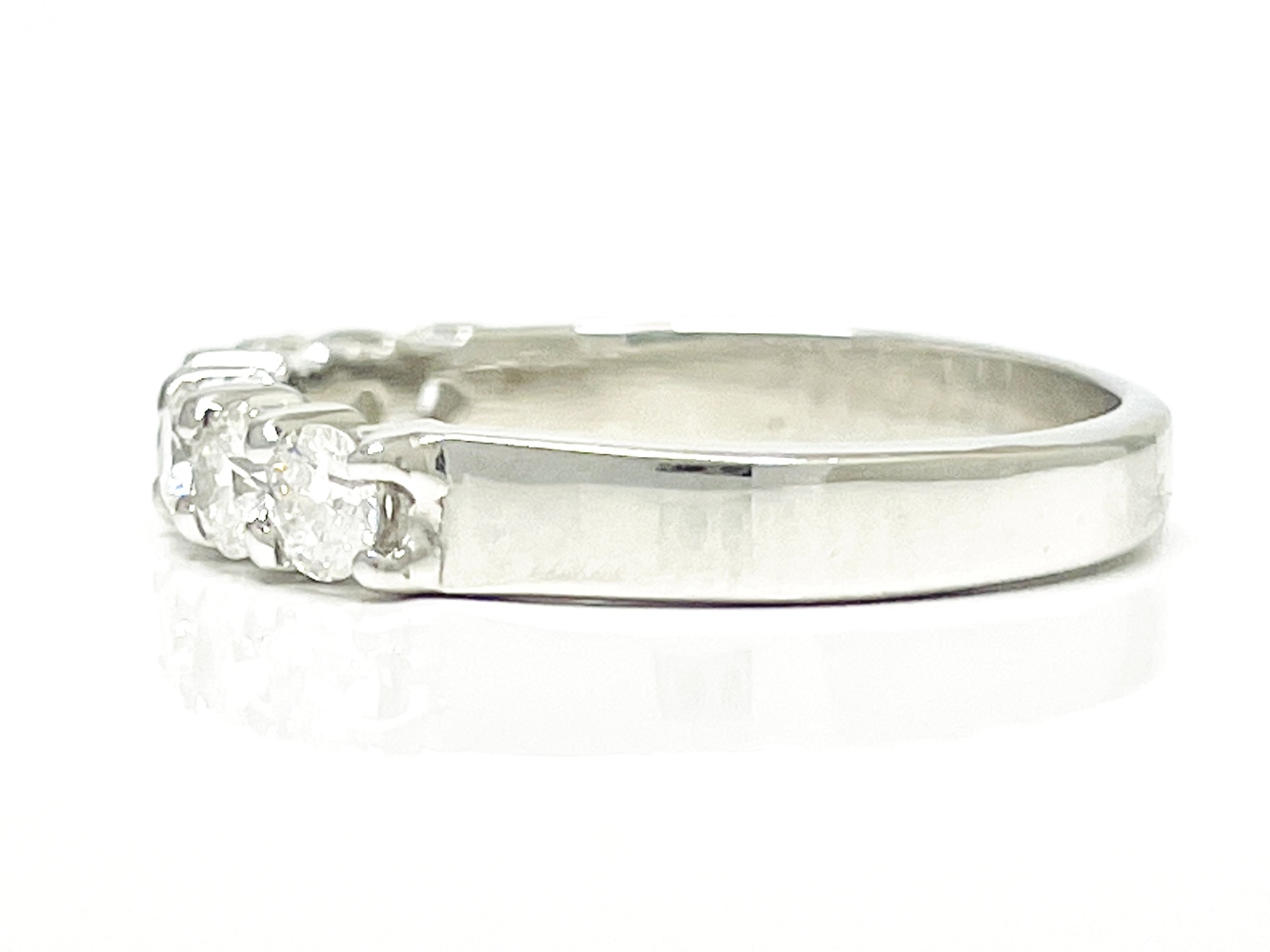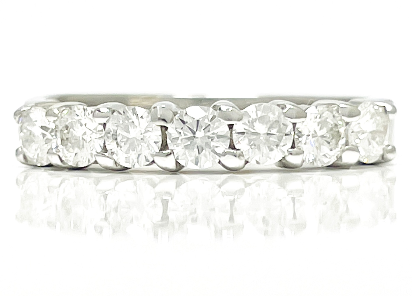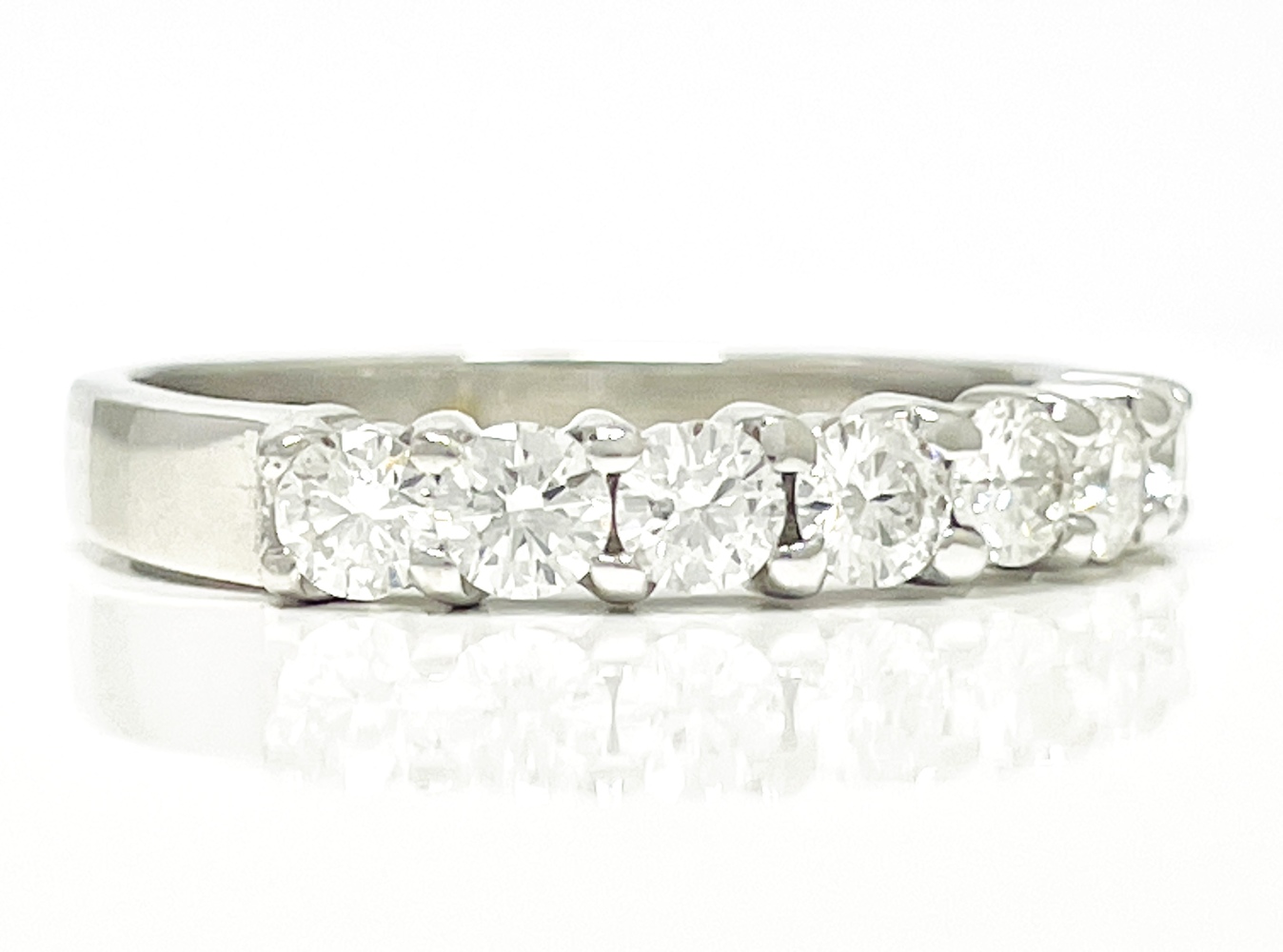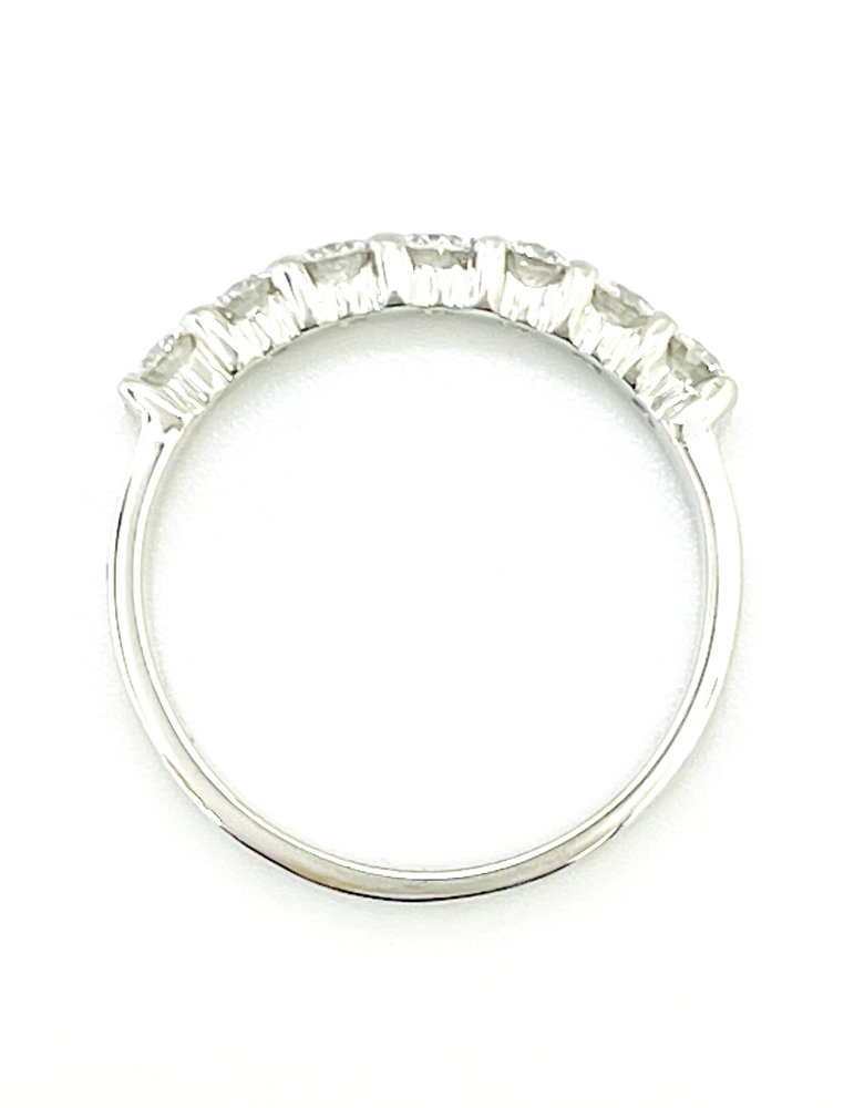 Embrace timeless elegance with this 18K white gold ring, graced by seven mesmerizing round diamonds totaling approximately .70 ctw. Each diamond, luminous with SI-Near colorless clarity, reflects ethereal light, elevating the ring's exquisite charm. Designed for a finger size of 5.75, this piece effortlessly weaves together classic beauty and modern sophistication. A true tribute to luxury and style, it perfectly captures the essence of pure brilliance and endless grace.