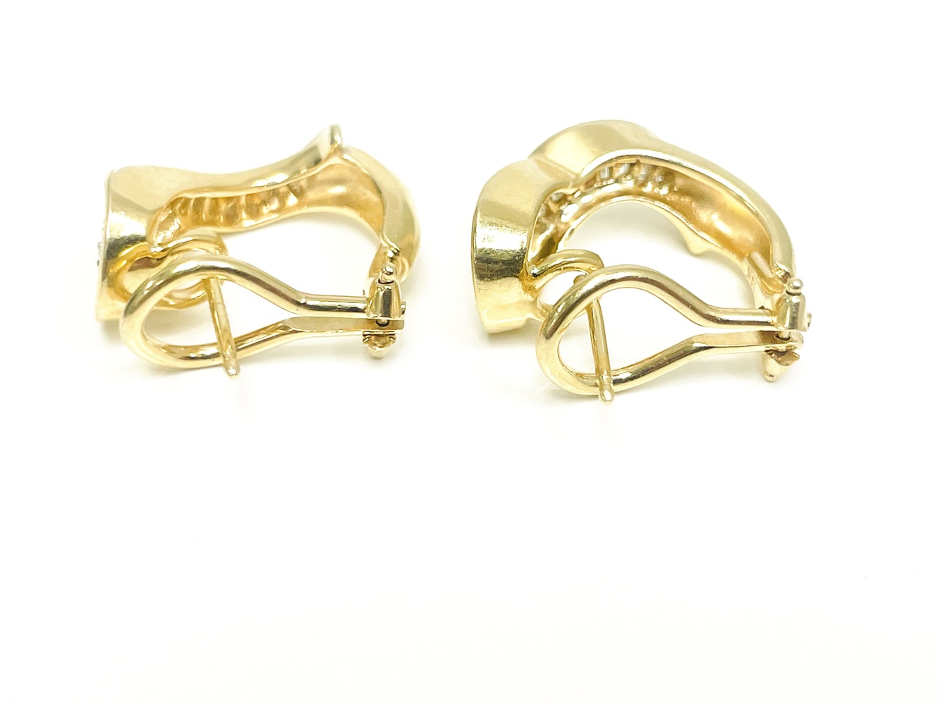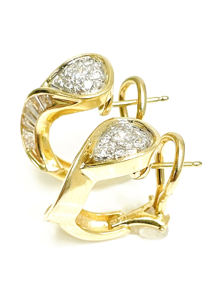 Exquisite 14K Yellow Gold Earrings showcasing a grand total of 32 natural diamonds. Combining 14 radiant Round Diamonds (.36 ctw) and 16 sparkling Baguettes (.40 ctw). All stones uphold SI2 clarity with a breathtaking Near Colorless display. A sumptuously elegant truth of fine jewelry craftsmanship that radiates a mesmerizing sparkle from every angle.