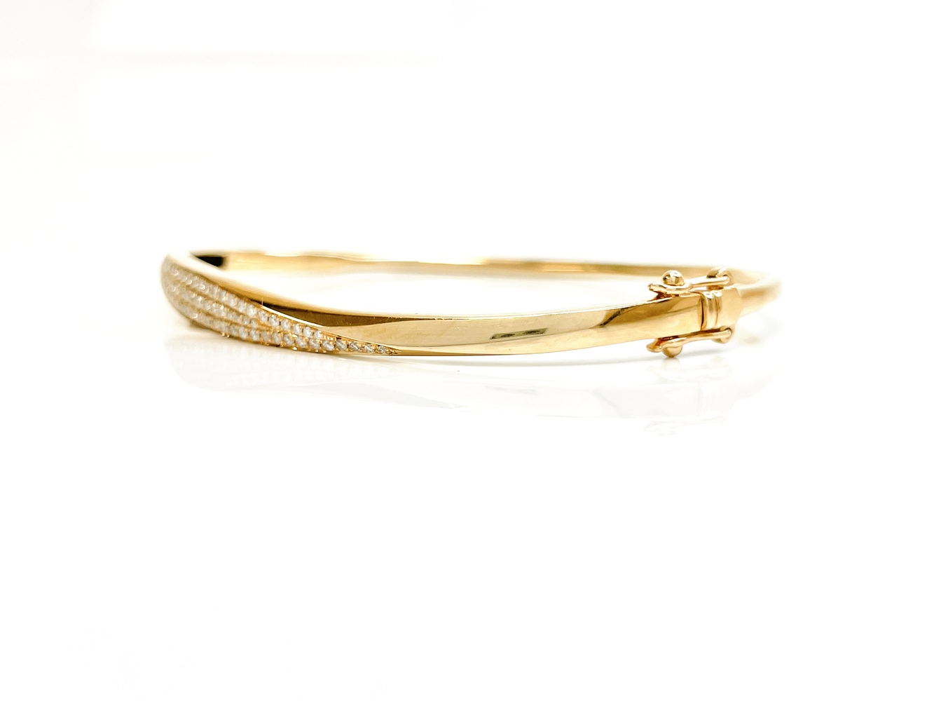 Indulge in refined elegance with this exquisite 18kt Yellow Gold Bangle. This timeless piece is immaculately crafted with attention to detail. Encrusted with 79 round-cut, near colorless Diamonds approximating 79 carats, it boasts of remarkable SI2/I1 clarity. The sophisticated radiance of this bangle enhances every gesture. An embodiment of grace and grandeur, it makes a stunning style statement, filling your appearance with a luxurious glow.