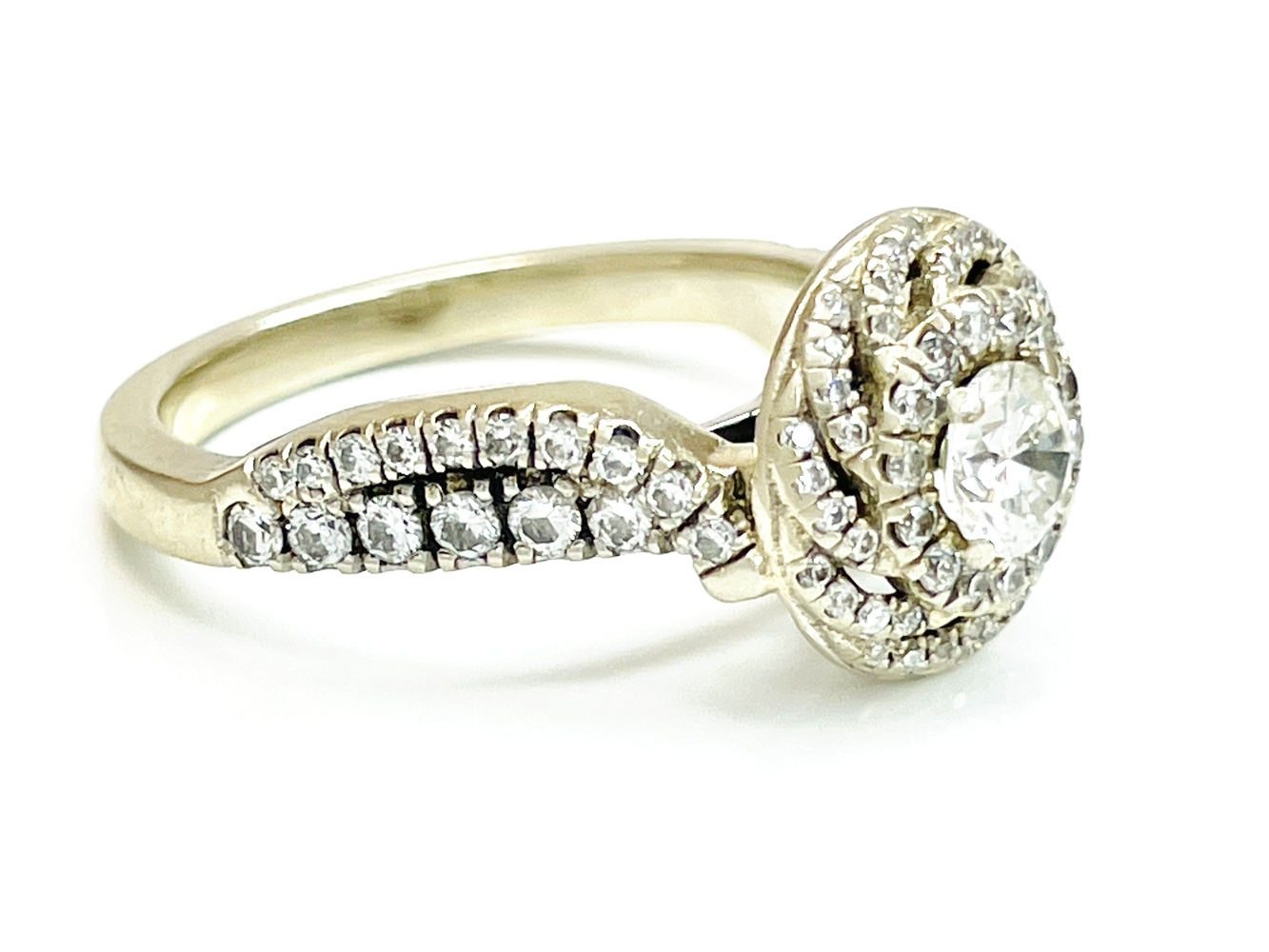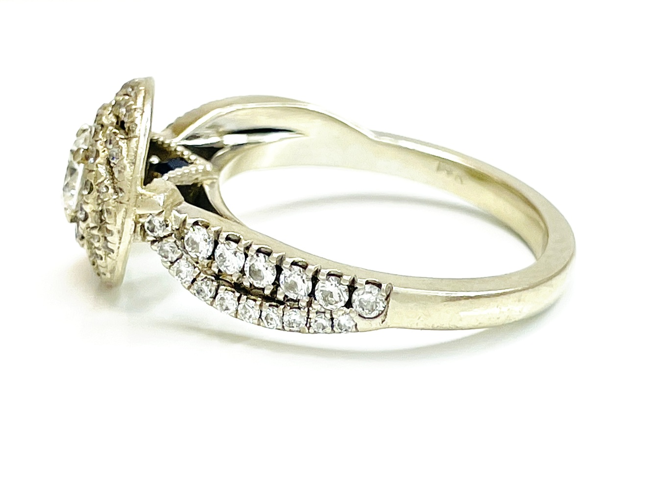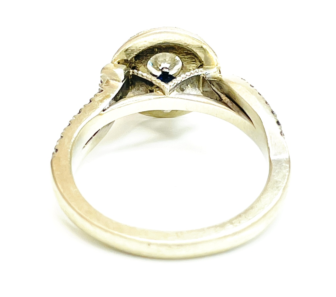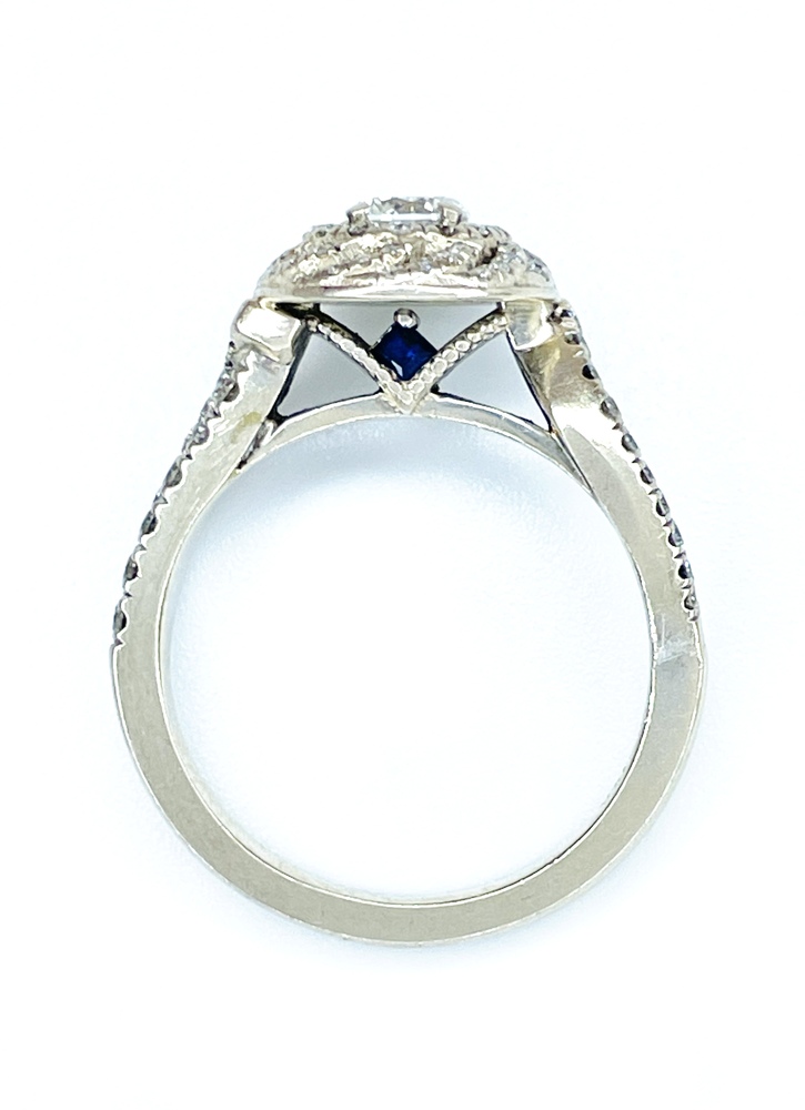 Adorn your elegance with this exquisite 14K White Gold Ring, meticulously crafted with radiant 86 Natural Round Diamonds. The stunning SI-Near Colorless center stone boasts an approximate .40 SI1 carat weight, complemented by glowing Princess Cut Sapphires, each a delicate 1mm in size. Combined gemstone weight totals approximately 1.25ctw, creating a sparkle that captivates. Revel in this timeless beauty, perfect in size 8.