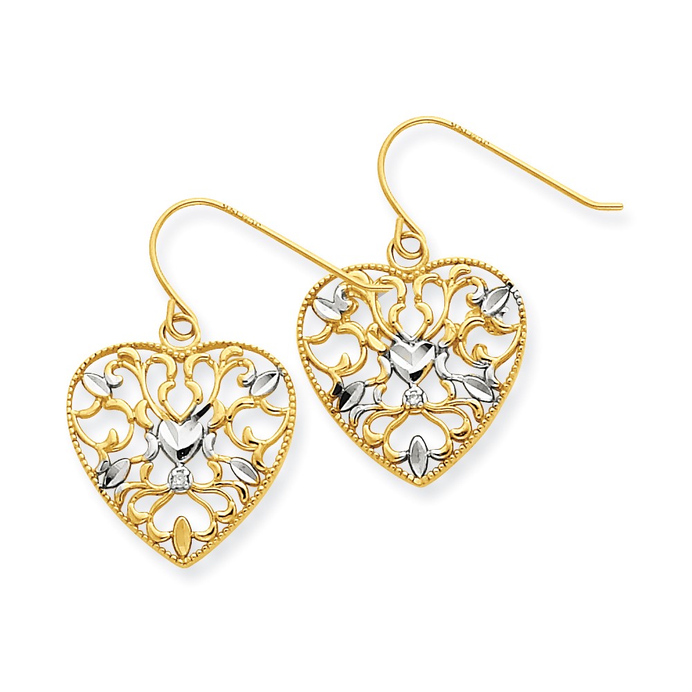 14K & Rhodium .01ct Diamond Filigree Heart Wire Earrings