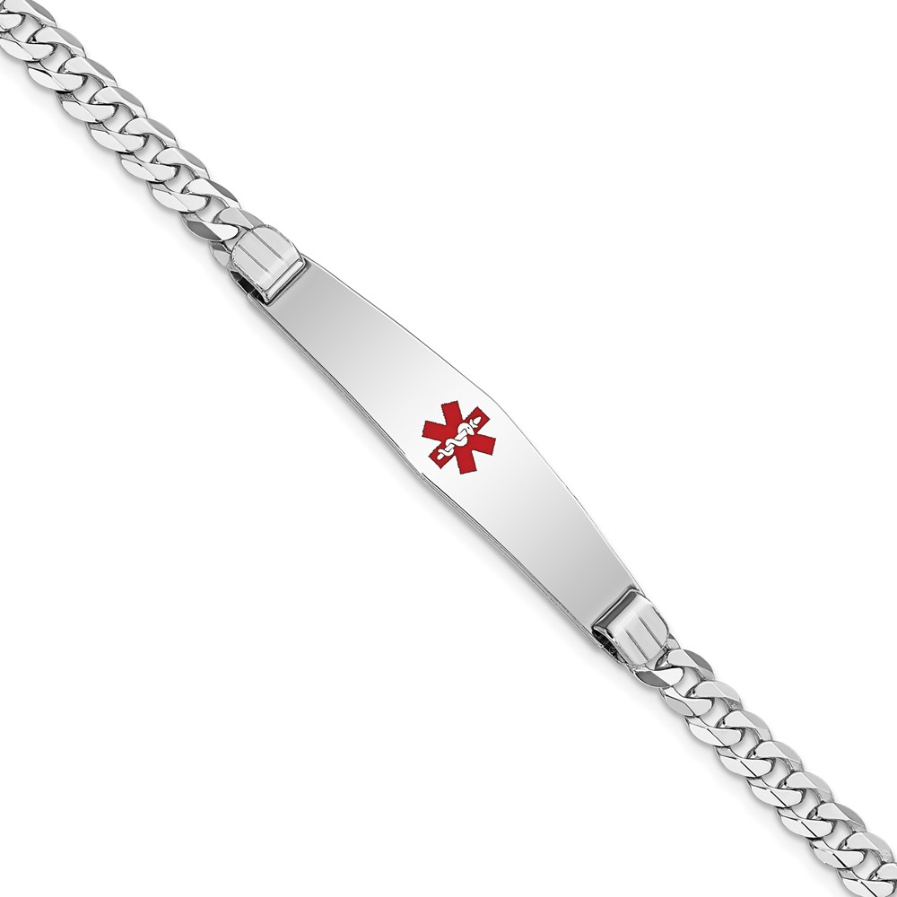 14K White Gold Medical Solid Chain/Solid Plate Soft Diamond Shape 36x9mm Centered Red Enamel Flat Curb Link 7 inch ID Bracelet