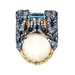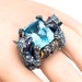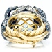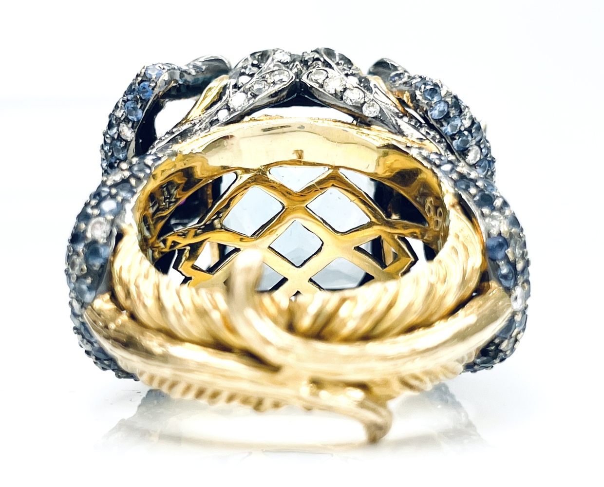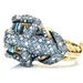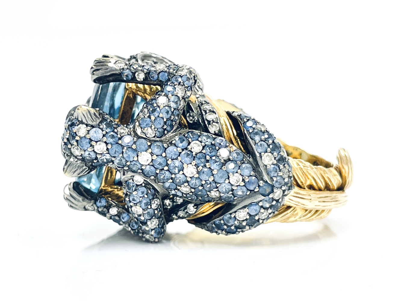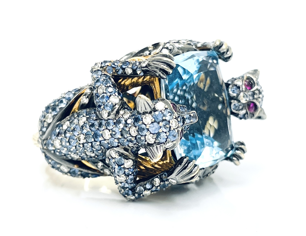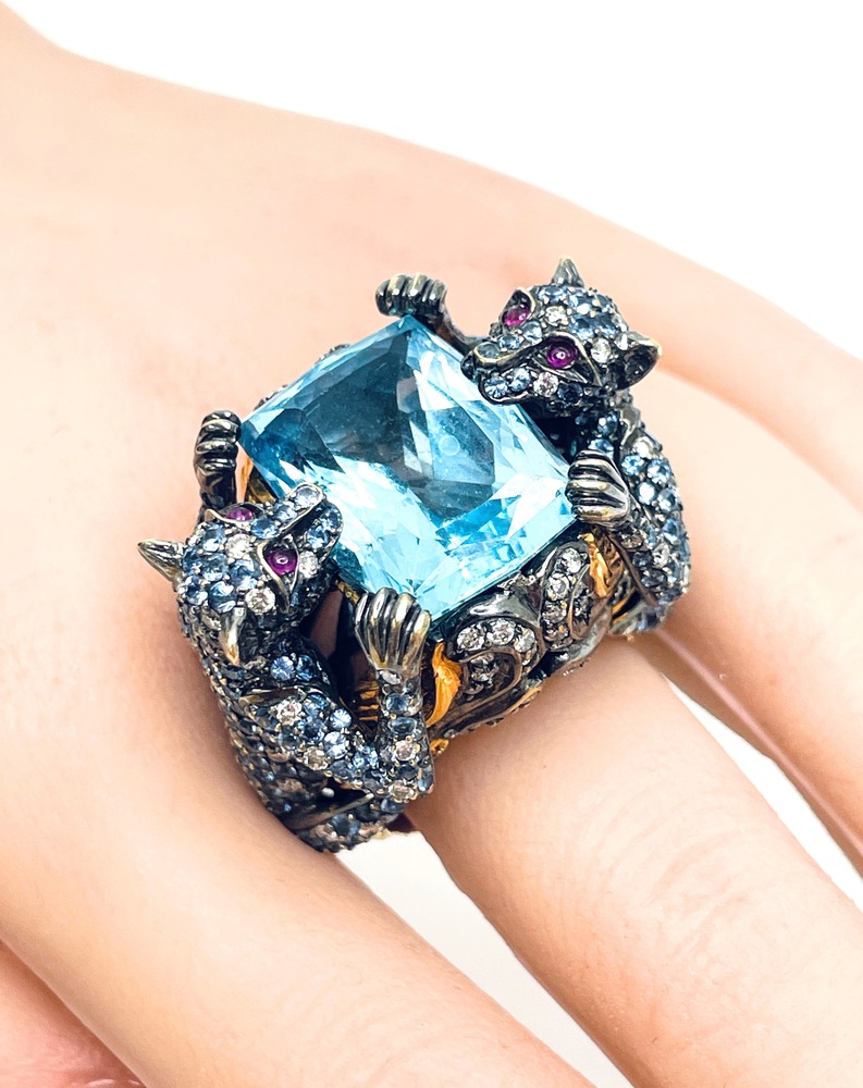 Exquisite 18kt yellow gold ring, enhanced by a mesmerizing 18.5x13mm blue topaz as the primary stone. Adorned with over 160 naturally round diamonds and round tanzanites, adding to the sparkle. The eye-catching design is completed by four 1.5mm round pink gemstones as eyes. An enchanting piece with colorless overtones and an approximate total stone weight of 2.0 ctw. Luxurious size 8.5. Embody elegance and sophistication with this unique treasure.