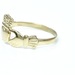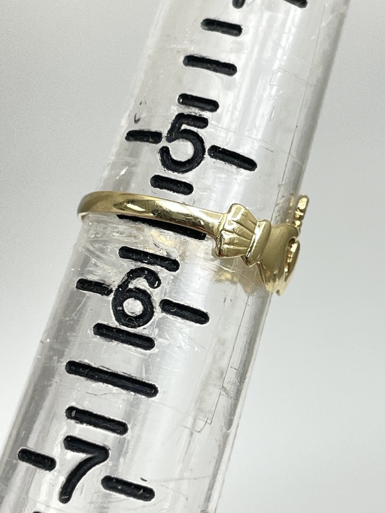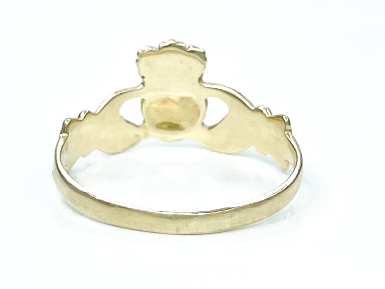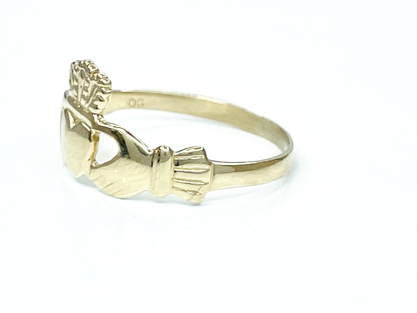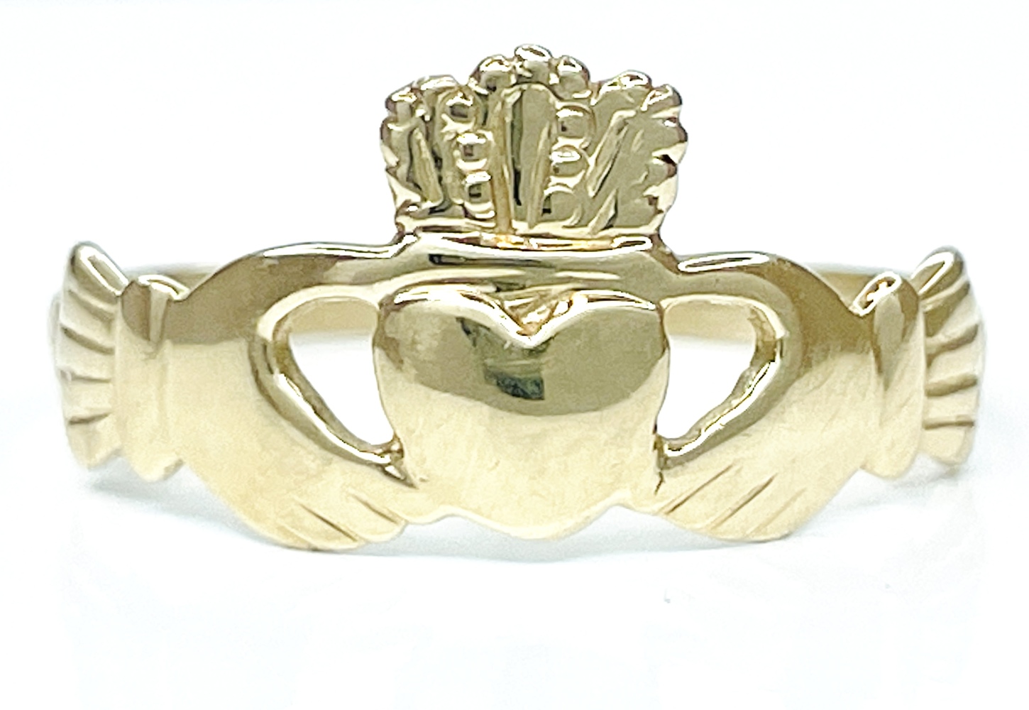 Experience the blend of Irish tradition and modern luxury with this exquisite 14K yellow gold Claddagh ring. Size 5.5, it embodies love, loyalty, and friendship symbolized by the heart, crown, and hands respectively. The high-quality gold gleaming with timeless elegance is a perfect representation of the strength in the unity of these virtues. This piece of jewelry is not just an accessory, but a heritage passed on for generations. Witness the allure of a classic design touched by artistry.
