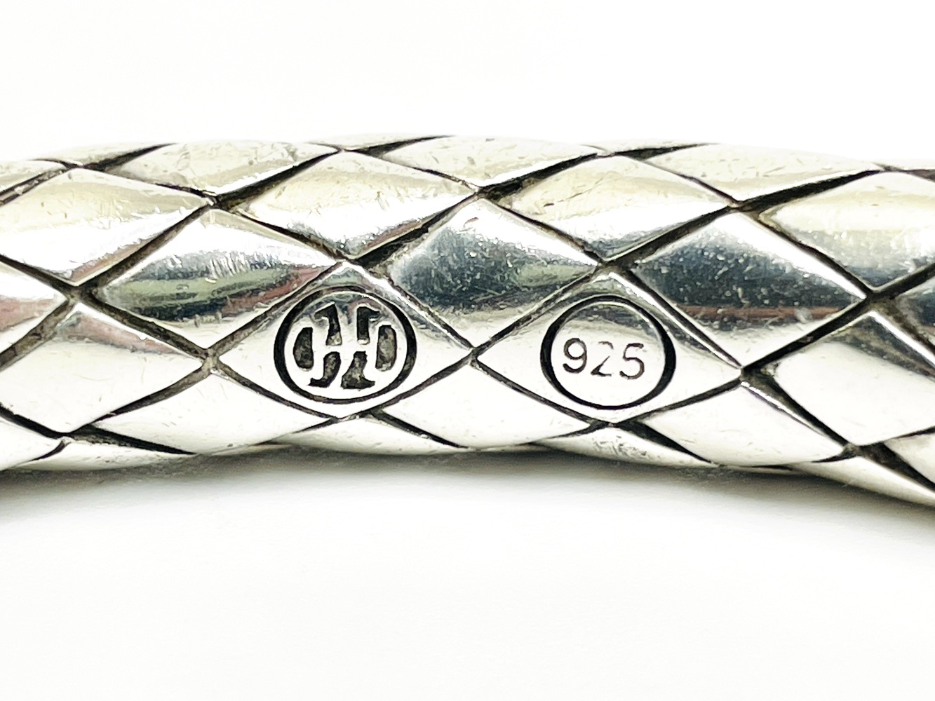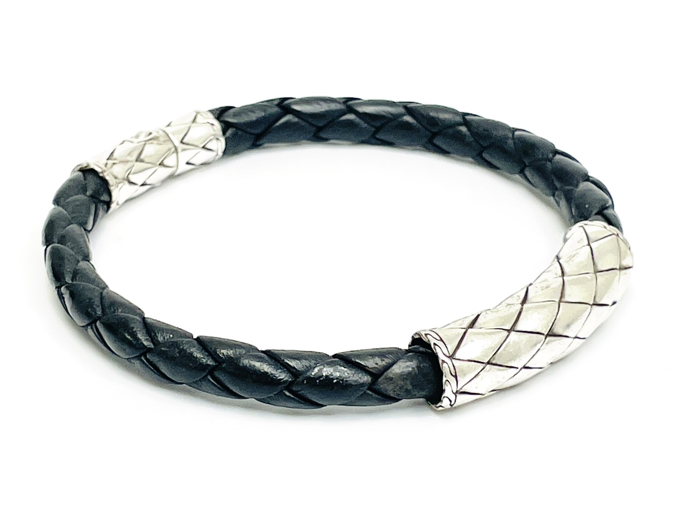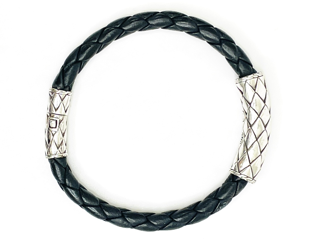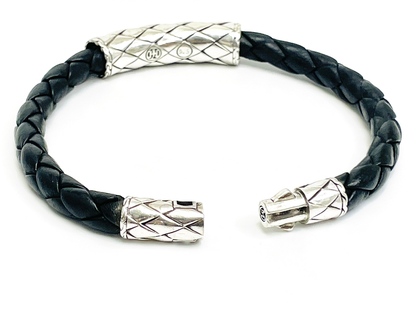 Embrace sophistication with this 925 John Hardy Sterling and Leather Bracelet. Weighing 26.3 grams and crafted to a length of 8 inches, it exudes timeless elegance. The intricate sterling silver is perfectly complemented by the robust leather, embodying John Hardy's impeccable craftsmanship. A masterpiece of design, it's a distinguished accessory for the discerning individual.