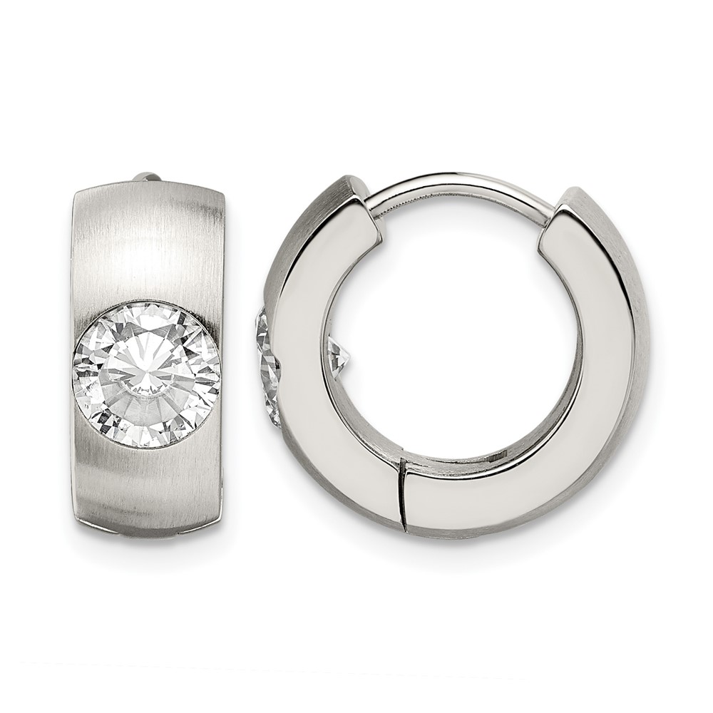 Chisel Stainless Steel Brushed and Polished with CZ Round 7mm Hinged Hoop Earrings