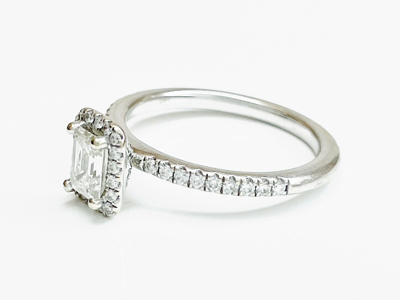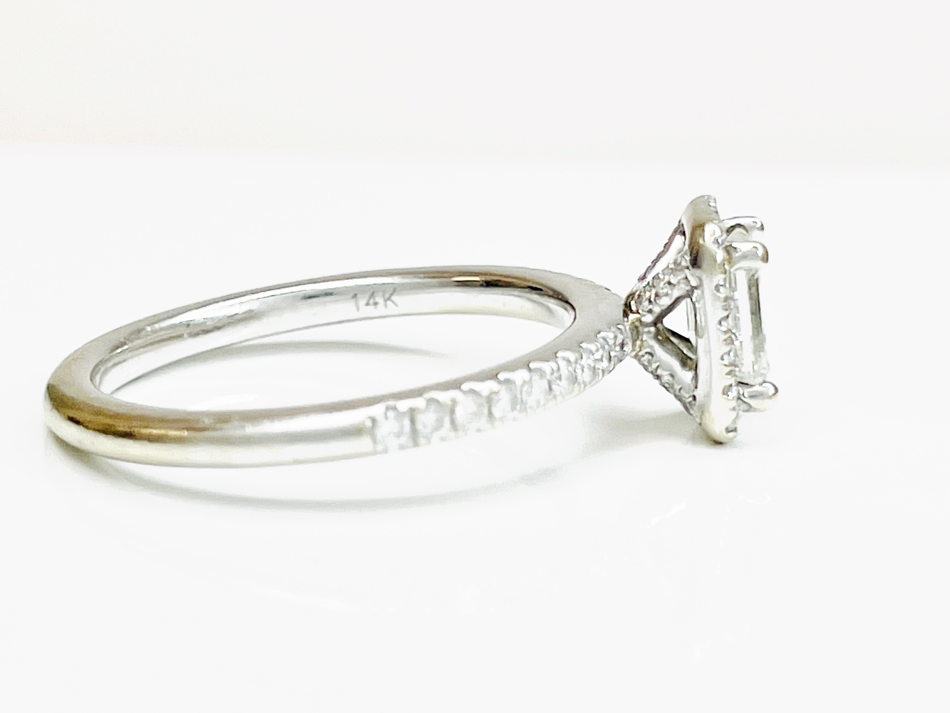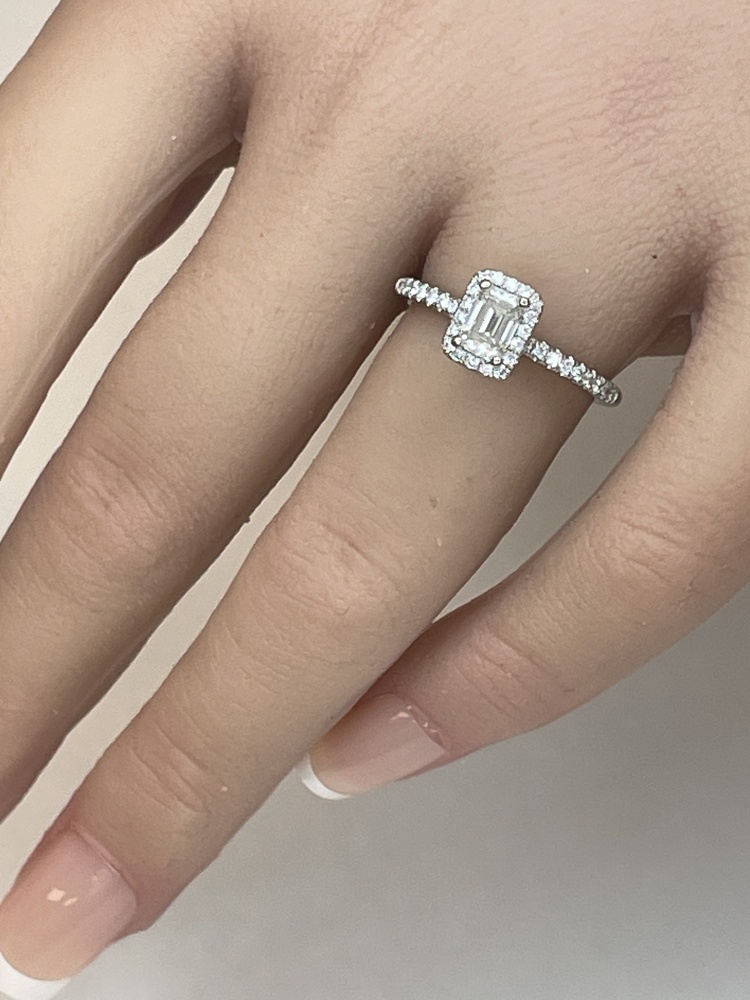 Embrace timeless elegance with this 14K white gold ring, exquisitely encrusted with 50 Natural Round Diamonds, approximately .55 ctw. Captivating attention lies the Natural Emerald Cut Diamond, measuring 5.4 x 3.8 mm, approximately .45-.50 ctw - a stunning centerpiece that effortlessly radiates luxury. With all natural diamonds of SI-Near Colorless quality, this piece promises a dazzling shimmer, ensuring unabashed glamour.