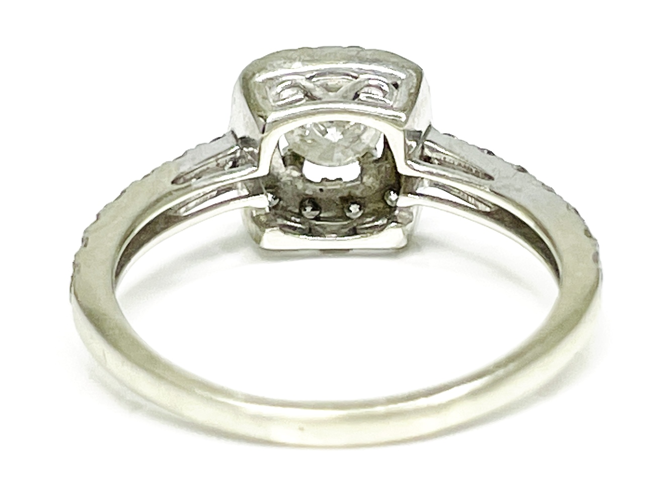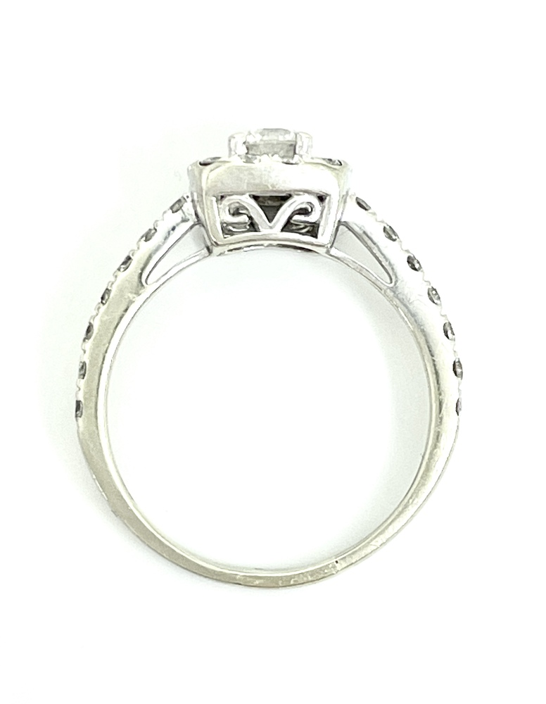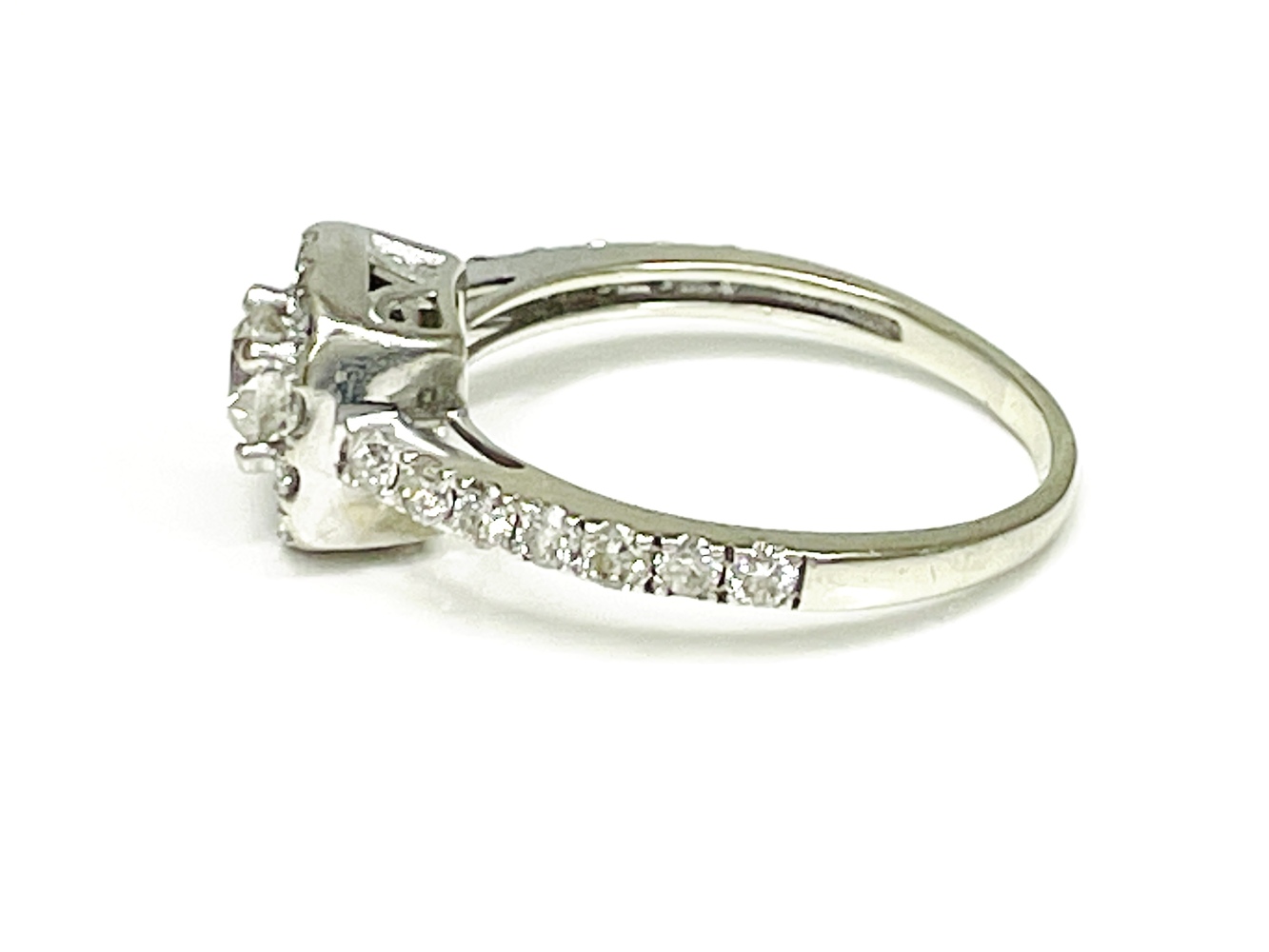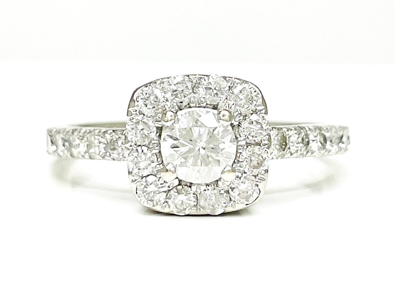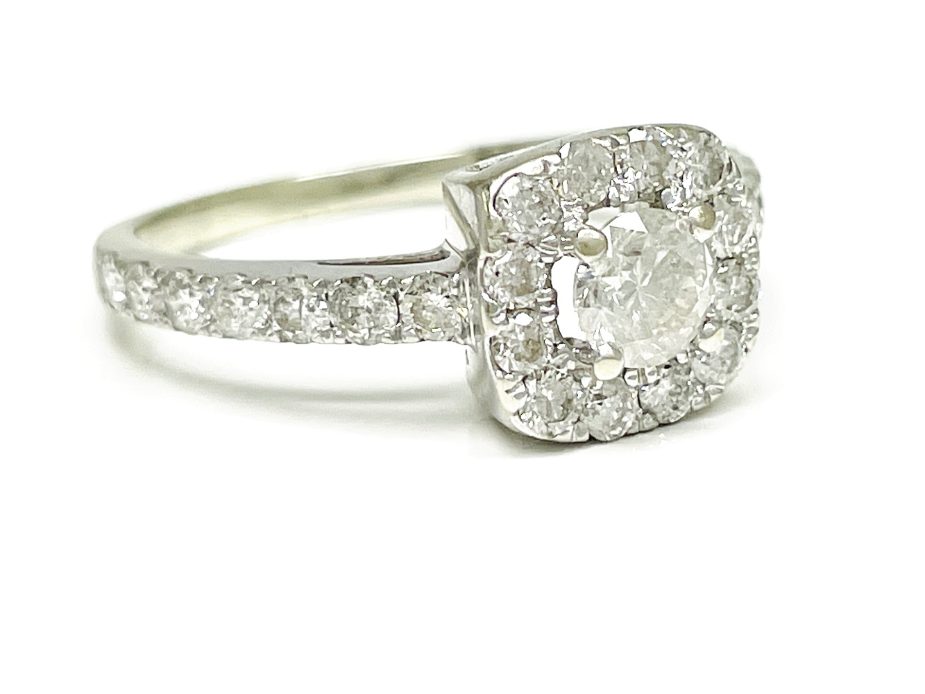 Embrace timeless elegance with our sparkling 10K white gold ring interspersed with an approximately .33 ctw center natural diamond. Complimented by approximately 26 round natural diamonds, weighing approximately .64 ctw, the stone's mesmerizing I1-Near Colorless clarity creates an undeniably radiant sparkle. Sized at 7.5, this stunning ring embellishes your hand with a bright, personalized style statement.