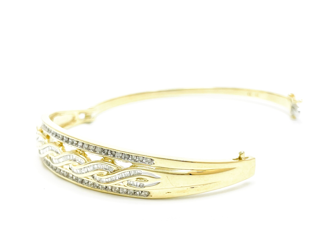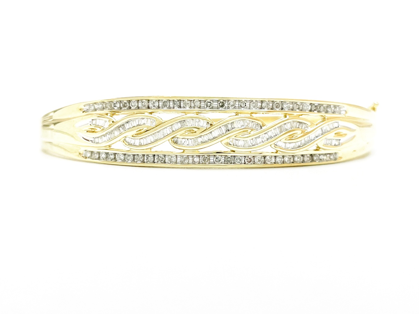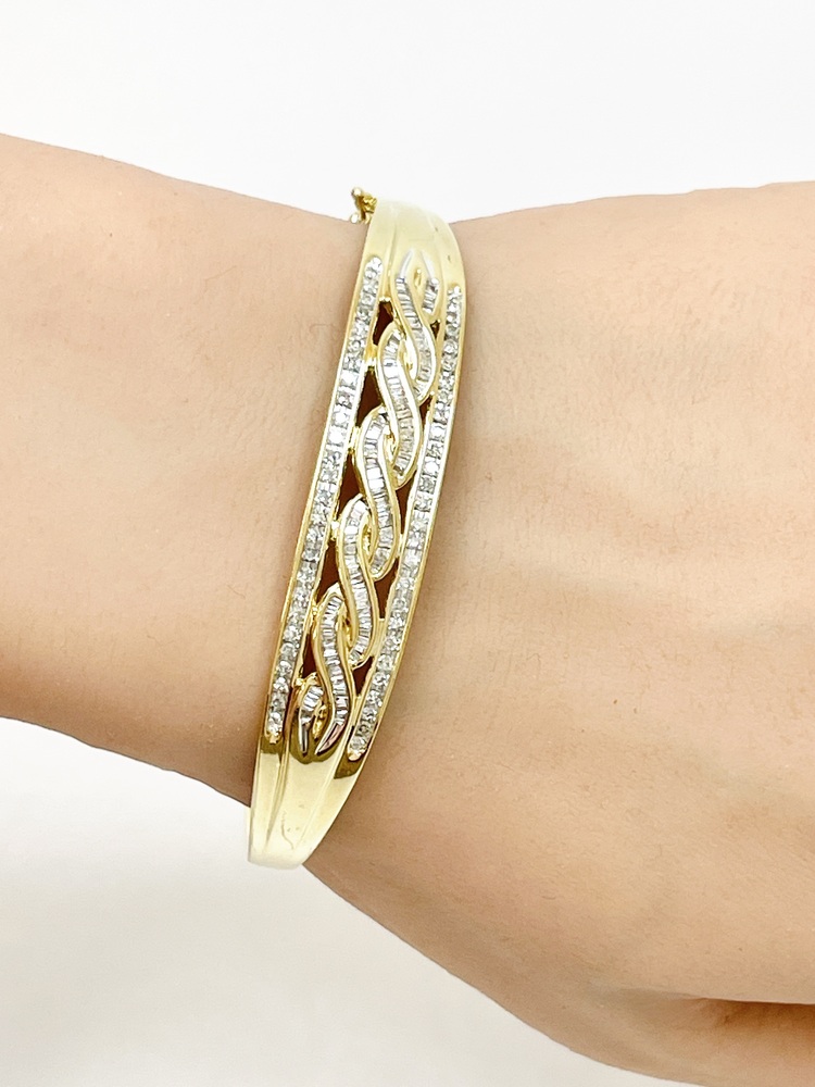 Indulge in the sheer elegance of this exquisite 10K Yellow Gold Bangle. Adorned with 56 round single cut diamonds equating to approximately .28 ctw and complemented by 88 regal baguettes totaling approximately .72 ctw, this piece emanates grandeur. At an ideal 7 inches, this magnificent bangle will add a chic touch to any outfit.