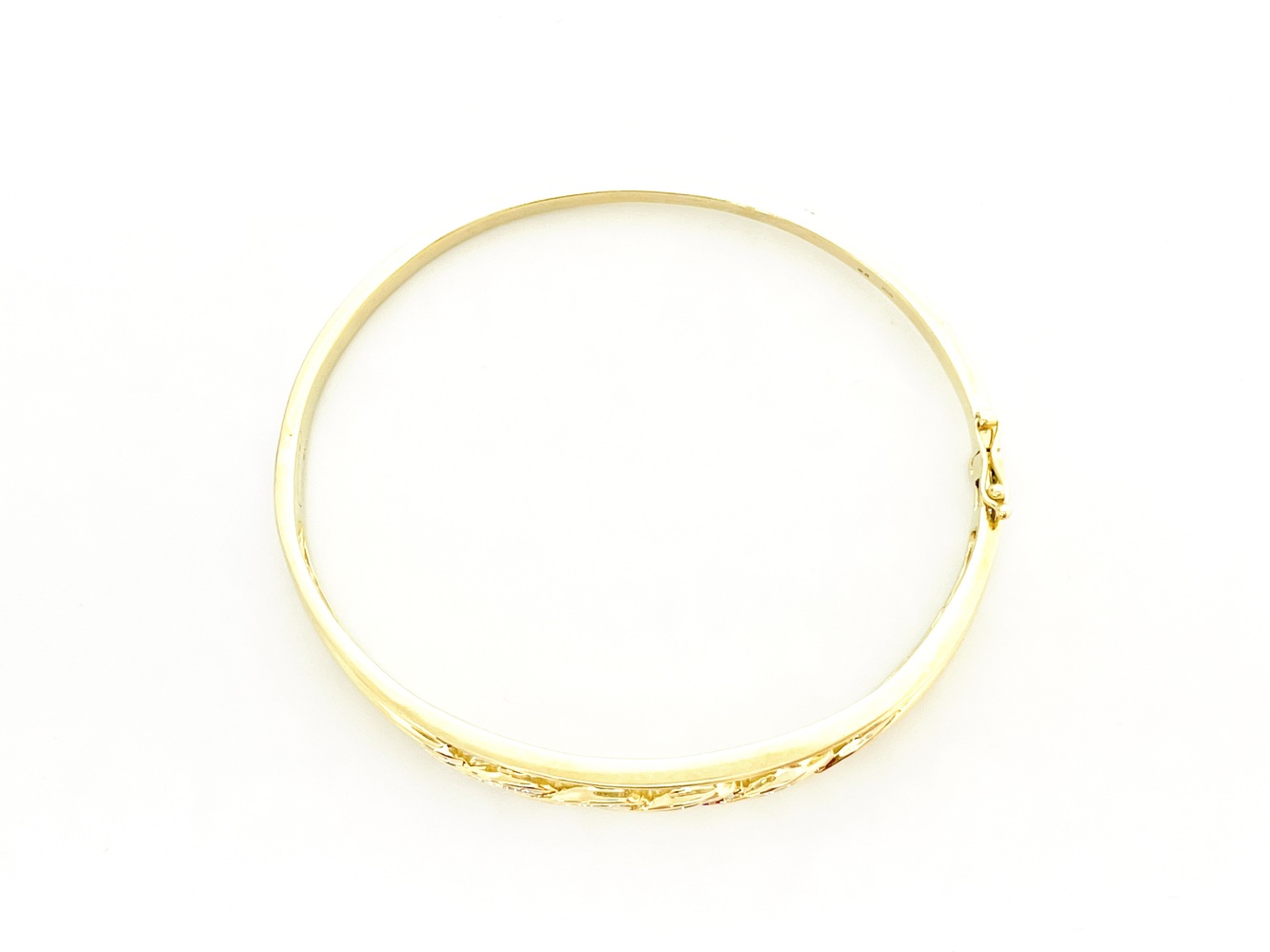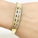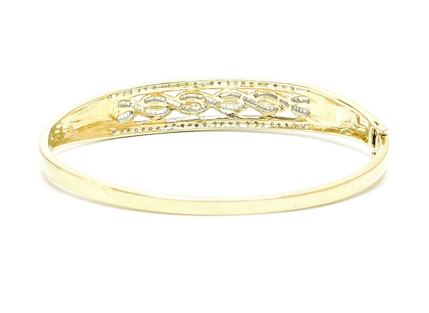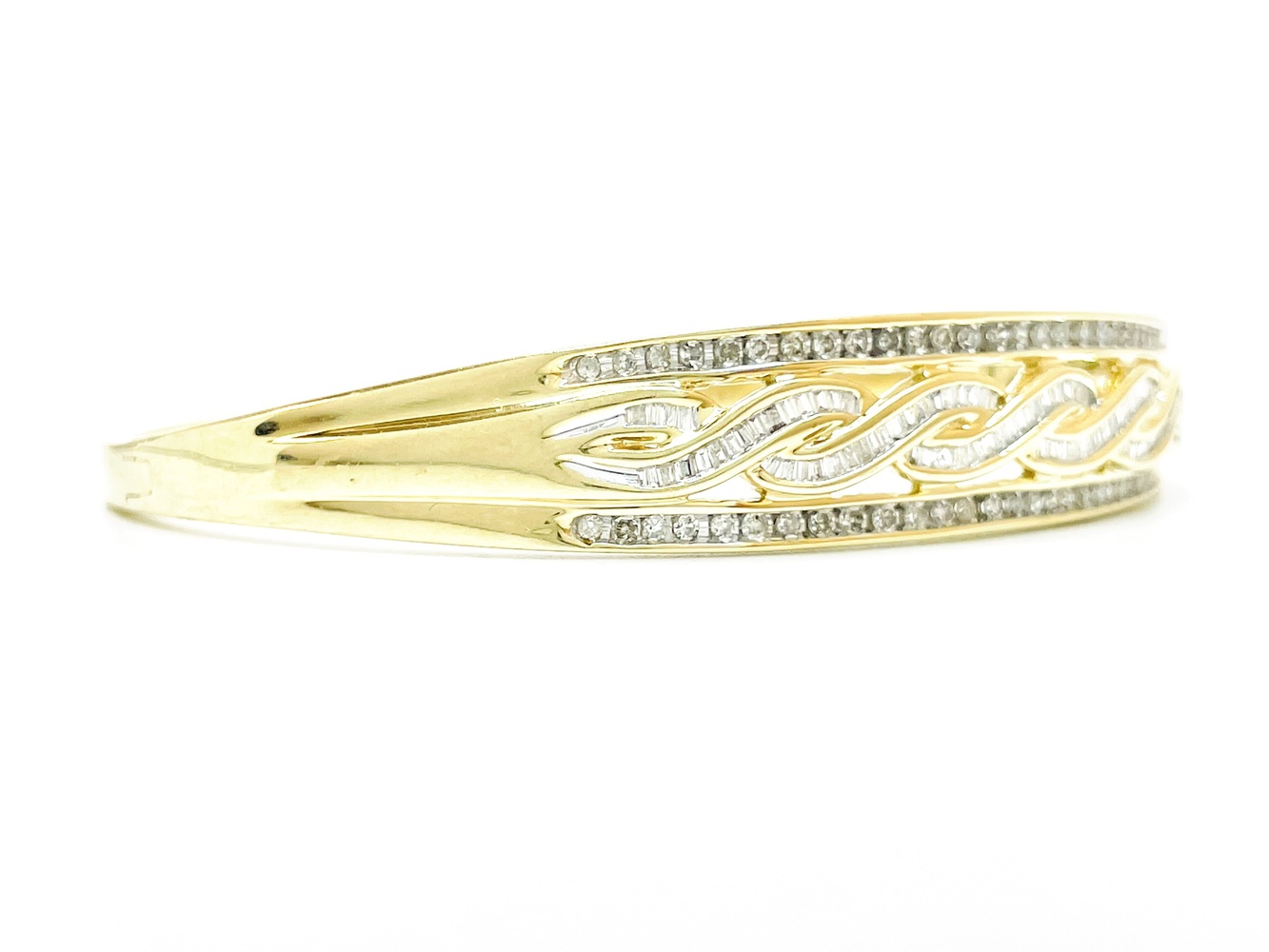 Indulge in the sheer elegance of this exquisite 10K Yellow Gold Bangle. Adorned with 56 round single cut diamonds equating to approximately .28 ctw and complemented by 88 regal baguettes totaling approximately .72 ctw, this piece emanates grandeur. At an ideal 7 inches, this magnificent bangle will add a chic touch to any outfit.