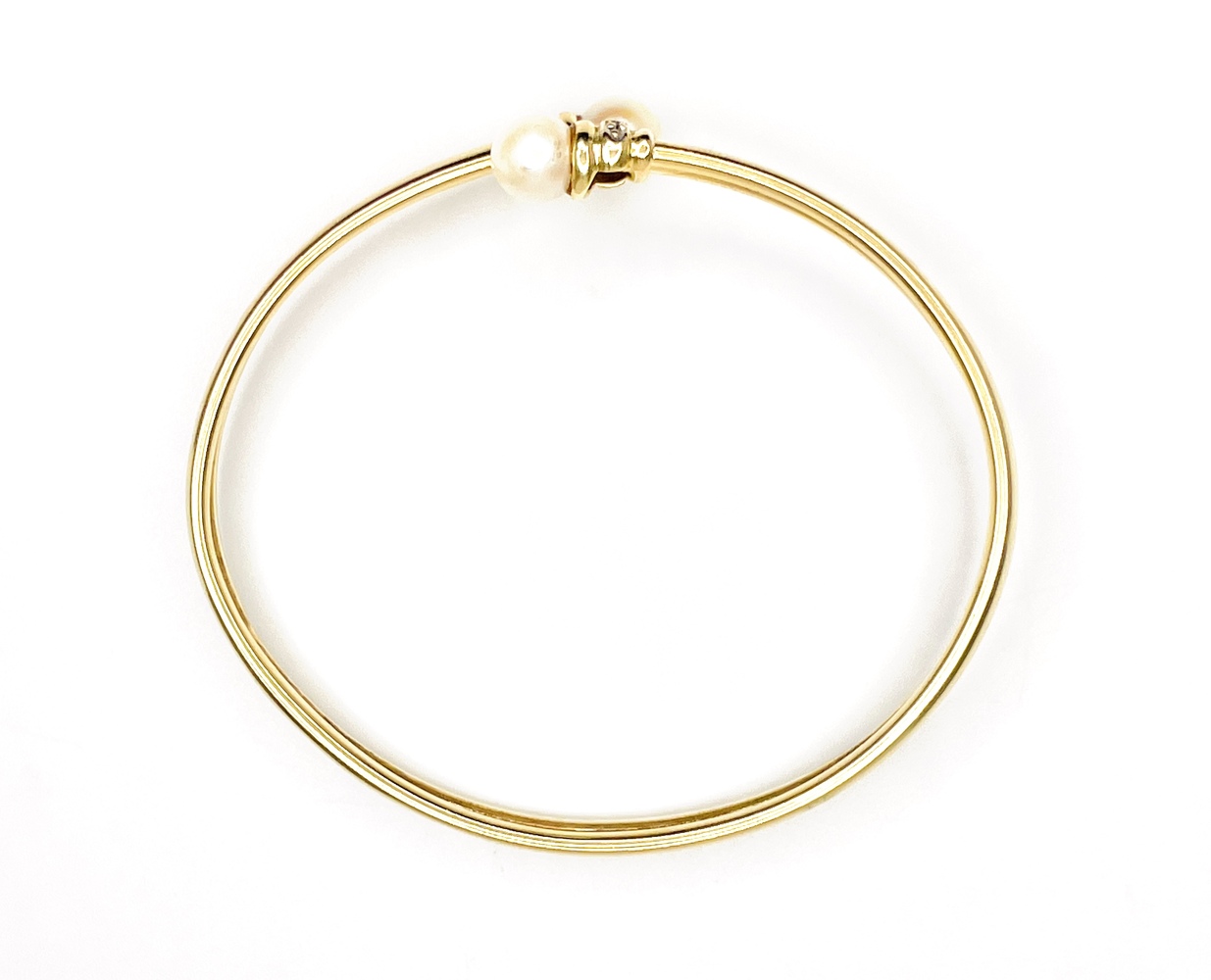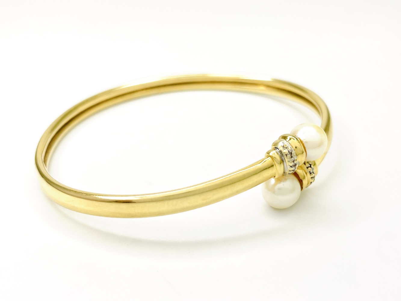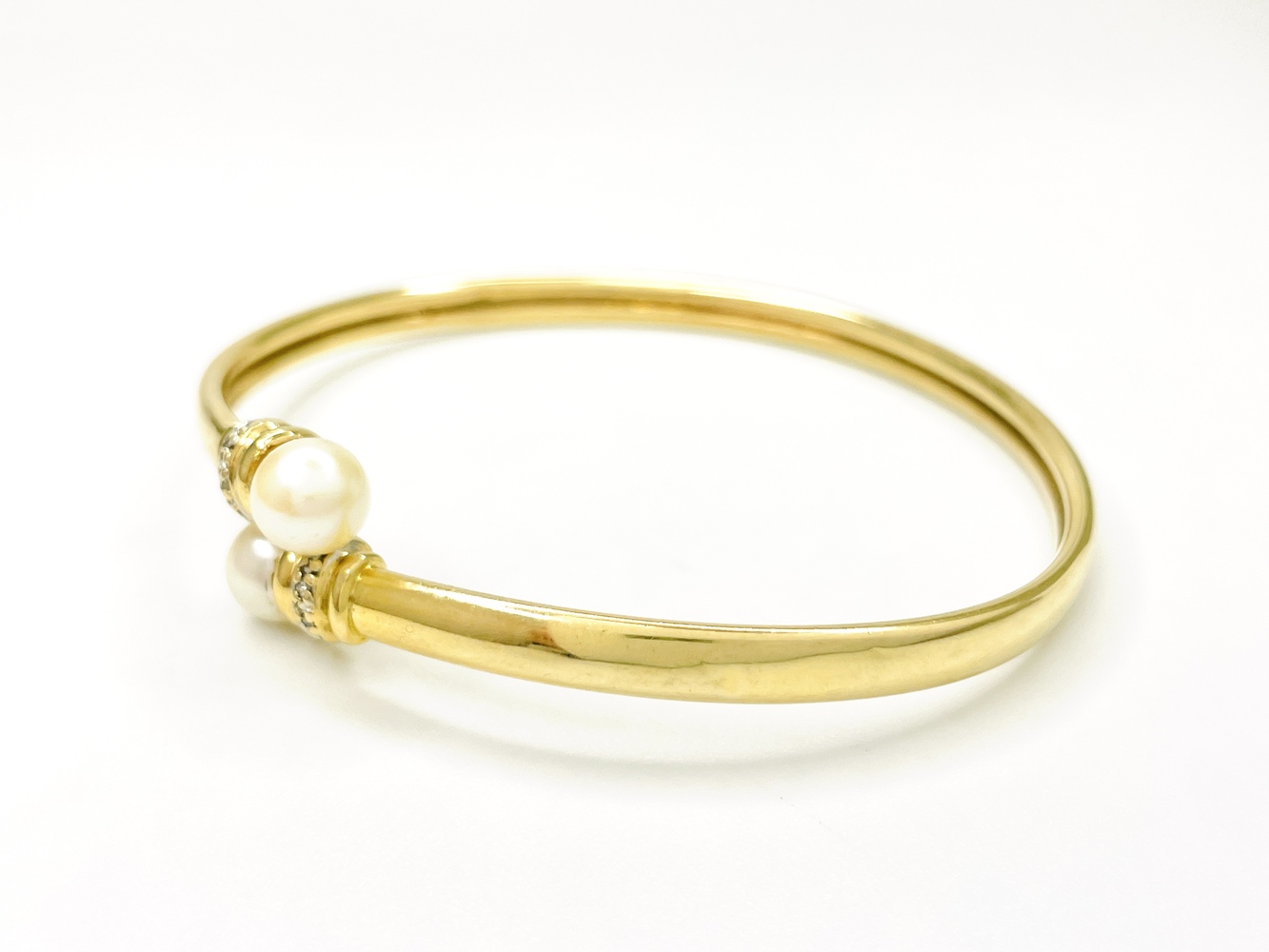 Elevate your style to new heights with our '14K Yellow Gold Diamond Pearl Bangle'. Showcasing 6 mesmerizing natural round diamonds and pearls, nestled beautifully on the band of 7". Feel the fusion of eternal elegance and modern style as this beautiful piece encircles your wrist, creating a captivating symphony of glittering glamour. An embodiment of luxury, this bangle promises to make a unique statement or a perfect heirloom piece.