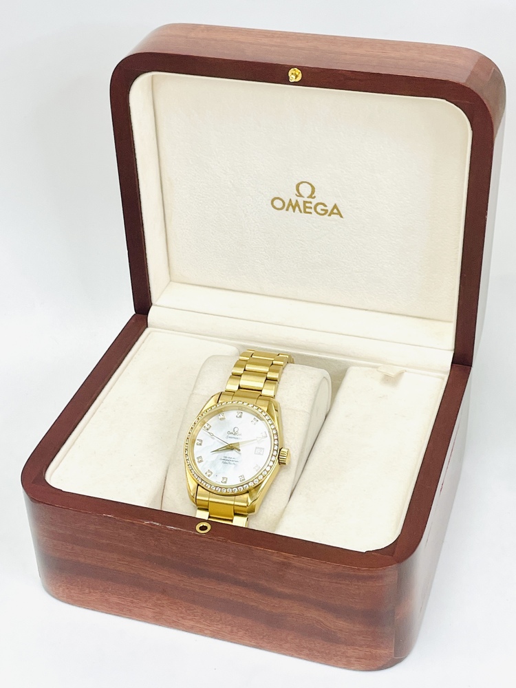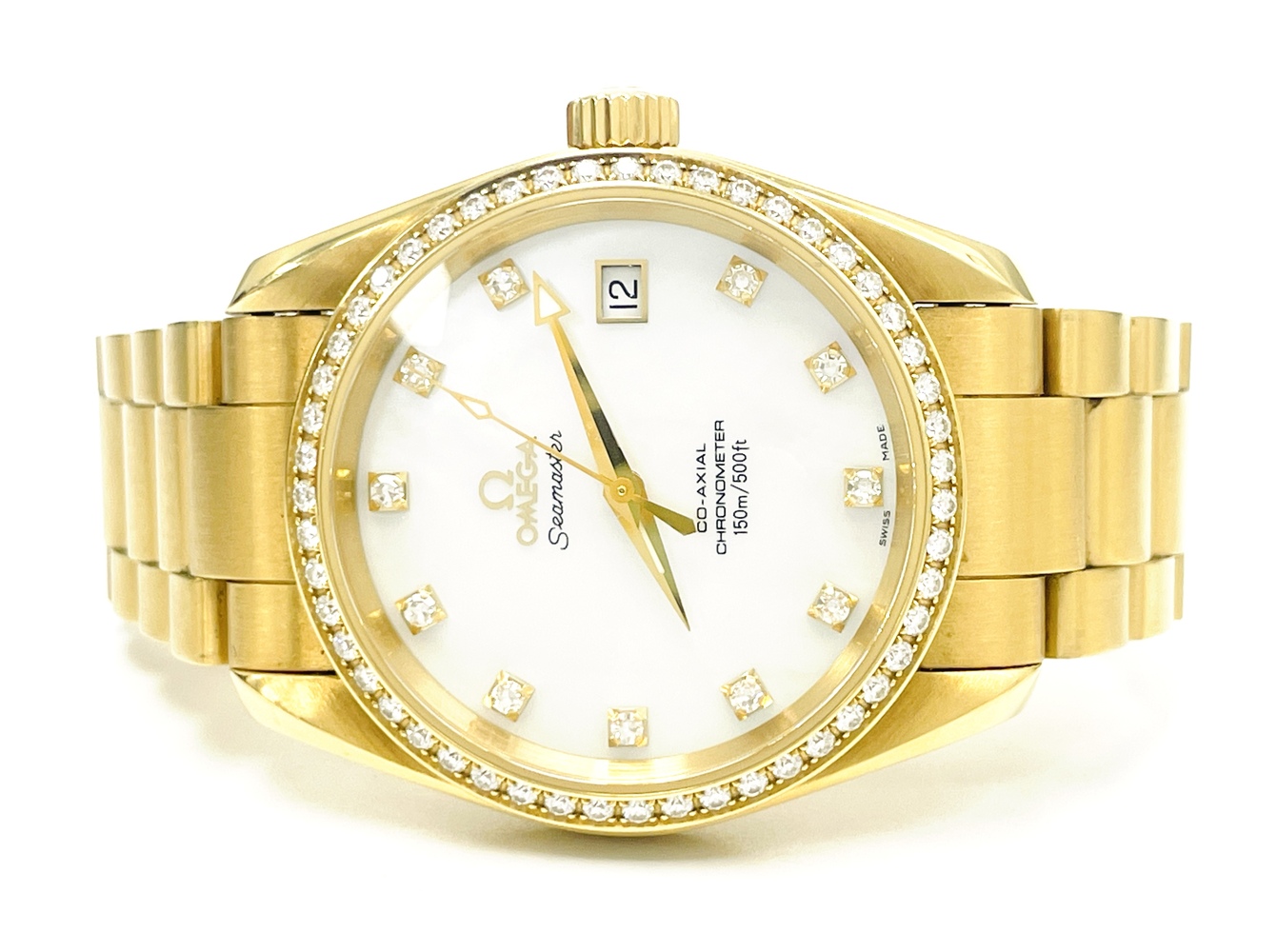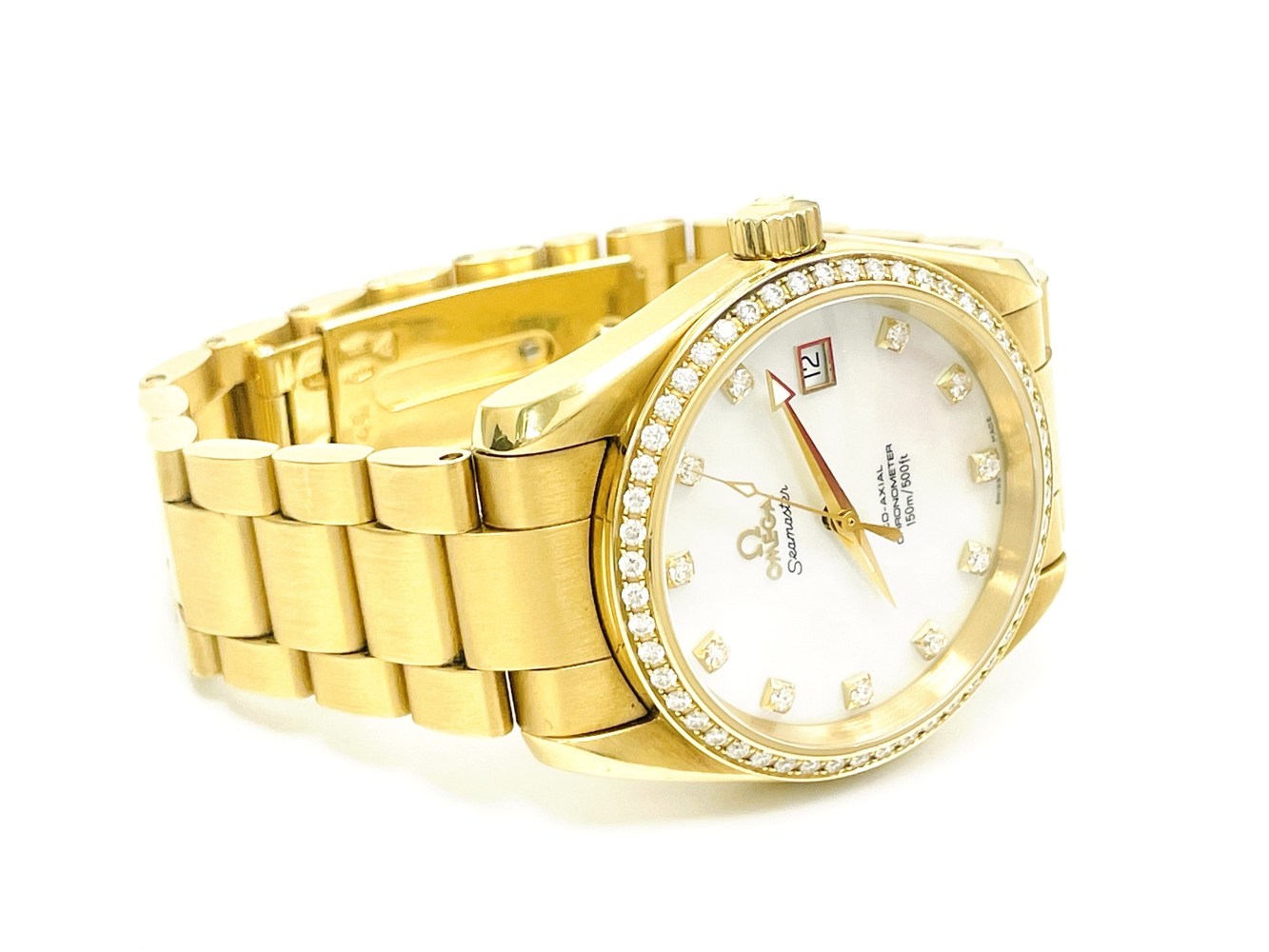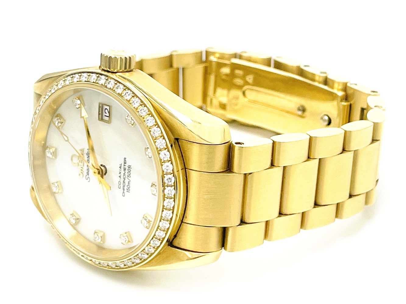 Exhibiting sheer craftsmanship, the Omega Seamaster, forged in red and yellow gold, is a testament of timeless elegance. Boasting a self-winding chronometer with a power reserve of 48 hours, it's aesthetically framed by a domed scratch-resistant sapphire crystal. Resilient against 150 metres of water pressure whilst showcasing a white dial adorned with diamonds. This 36.2 mm classic marries functionality with grandeur, securely fastening with a sliding clasp on a radiant yellow gold bracelet.