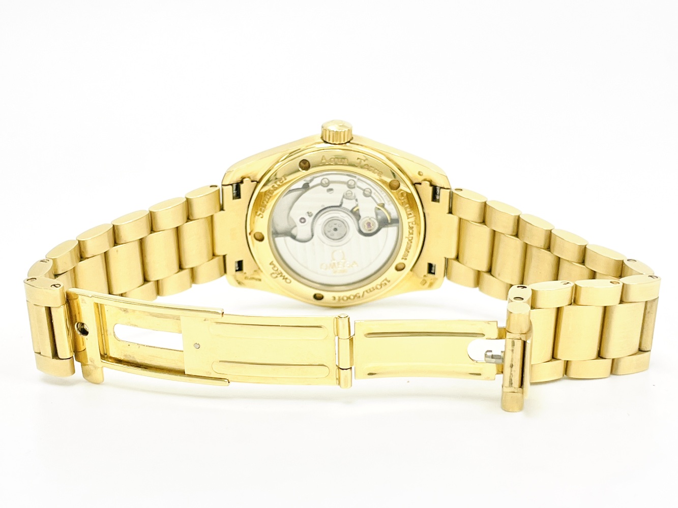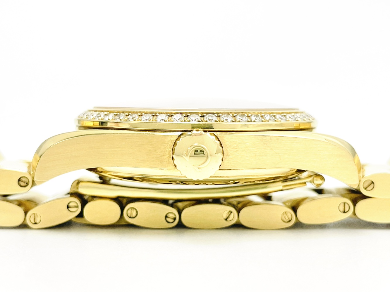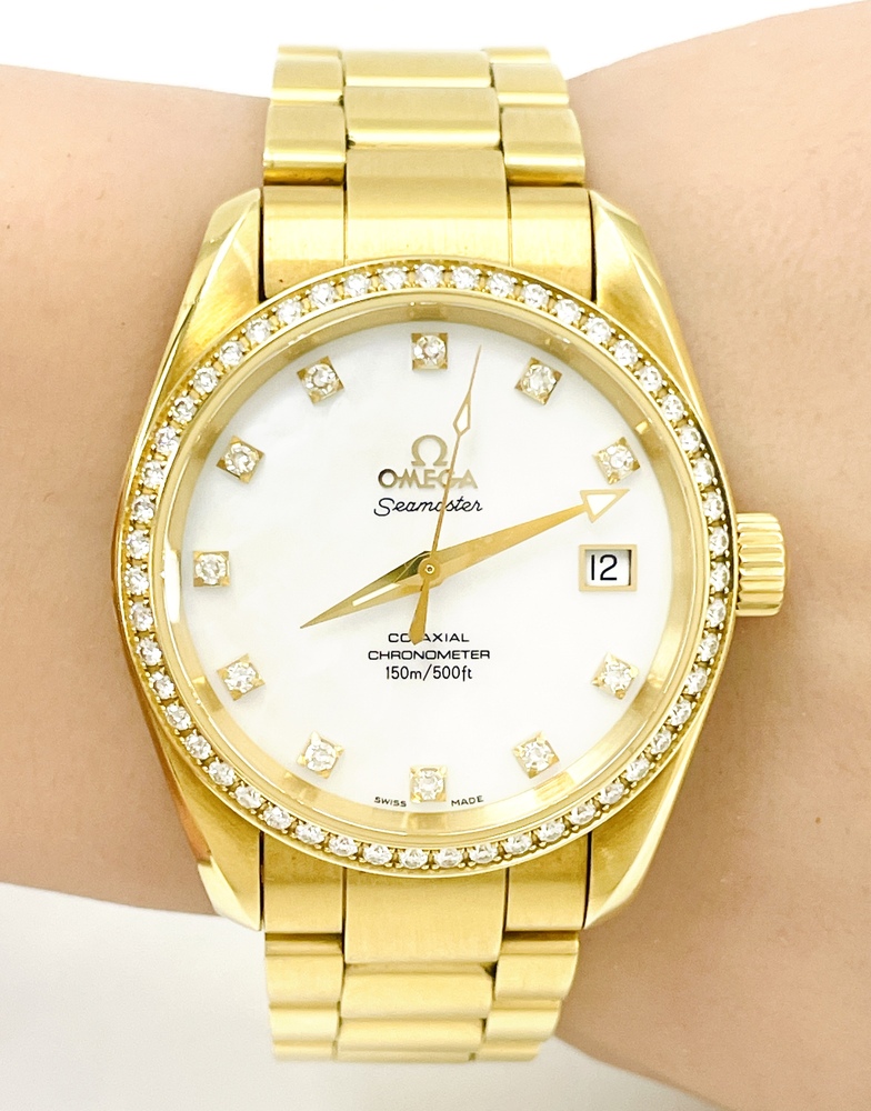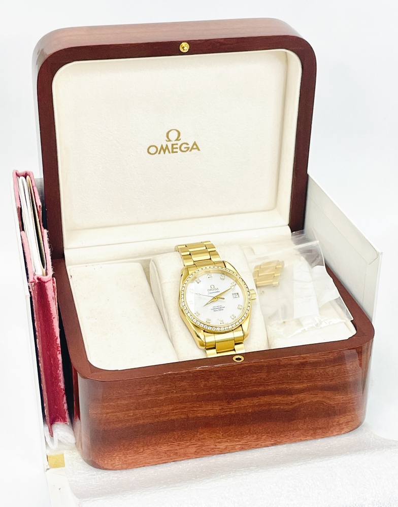 Exhibiting sheer craftsmanship, the Omega Seamaster, forged in red and yellow gold, is a testament of timeless elegance. Boasting a self-winding chronometer with a power reserve of 48 hours, it's aesthetically framed by a domed scratch-resistant sapphire crystal. Resilient against 150 metres of water pressure whilst showcasing a white dial adorned with diamonds. This 36.2 mm classic marries functionality with grandeur, securely fastening with a sliding clasp on a radiant yellow gold bracelet.