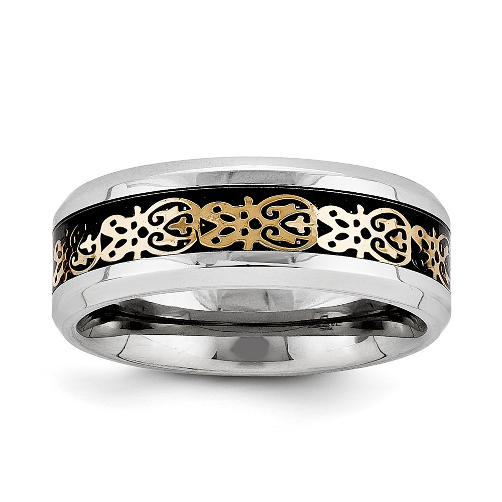 Stainless Steel 8mm & Yellow IP Patterned BandBand Width: 8 mmMaterial: Primary: Stainless SteelWidth of Item: 8 mmProduct Type: JewelryJewelry Type: RingsTexture: PatternedMaterial: Primary - Color: WhiteRing Type: Wedding Bands
