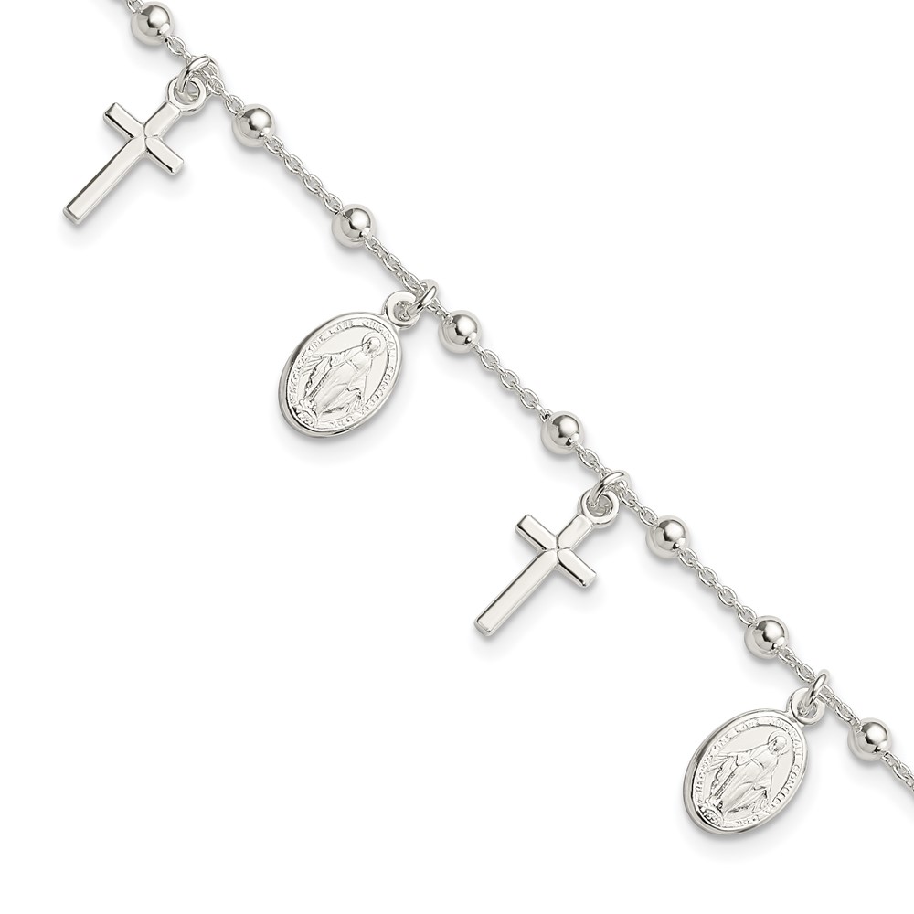 Sterling Silver Polished w/1in ext Cross Miraculous Medal Bracelet