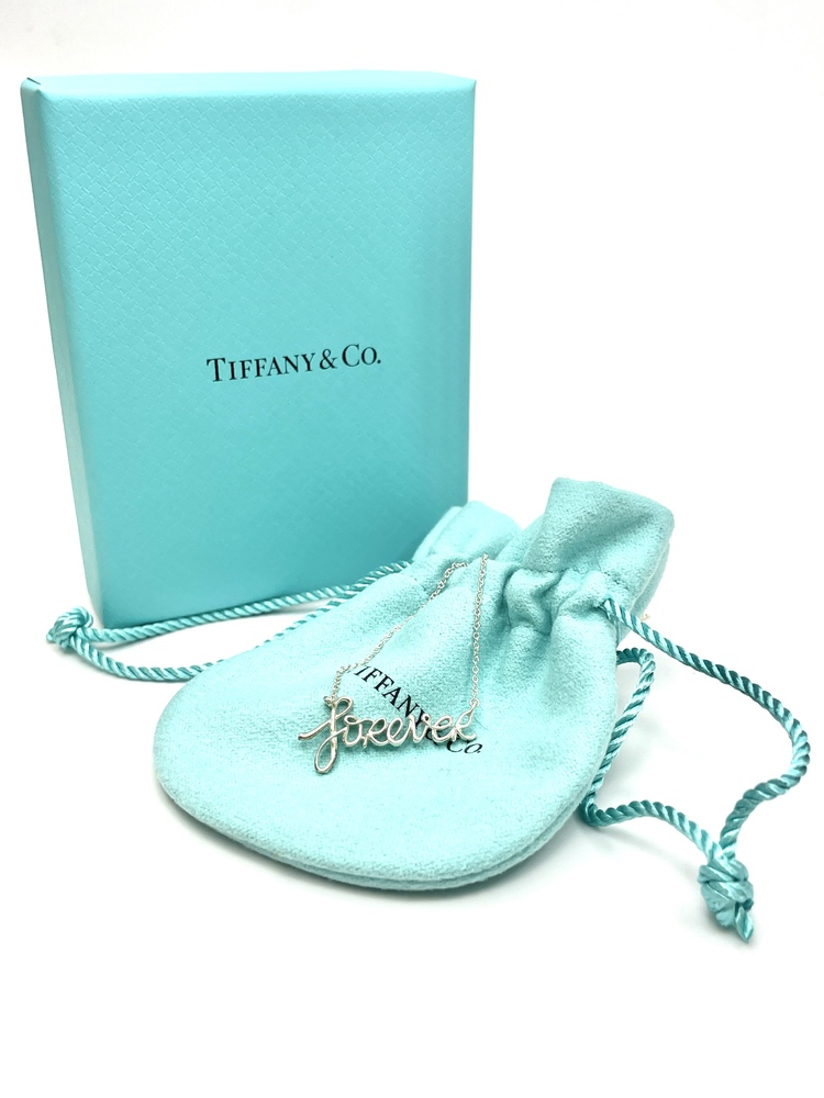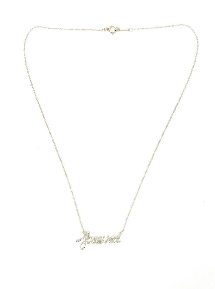 Unleash your elegant rebellion with this Tiffany & Co. Paloma Picasso Sterling 'Forever' Graffiti Pendant Necklace. Crafted from .925% lustrous sterling silver and artistically engraved with the timeless word 'Forever', this boutique piece is as enduring as it is alluring. Finished with a delicate 16" chain, it comes with an exclusive box, perfect for gifting or treasuring. Forever is now around your neck, own it!