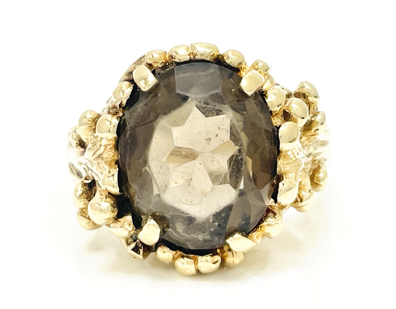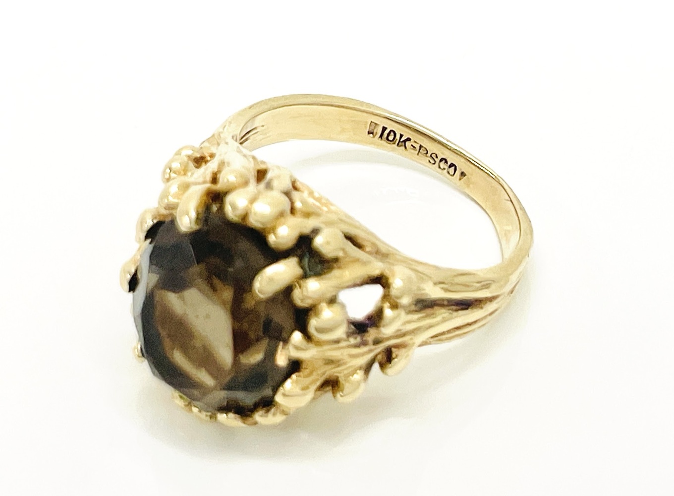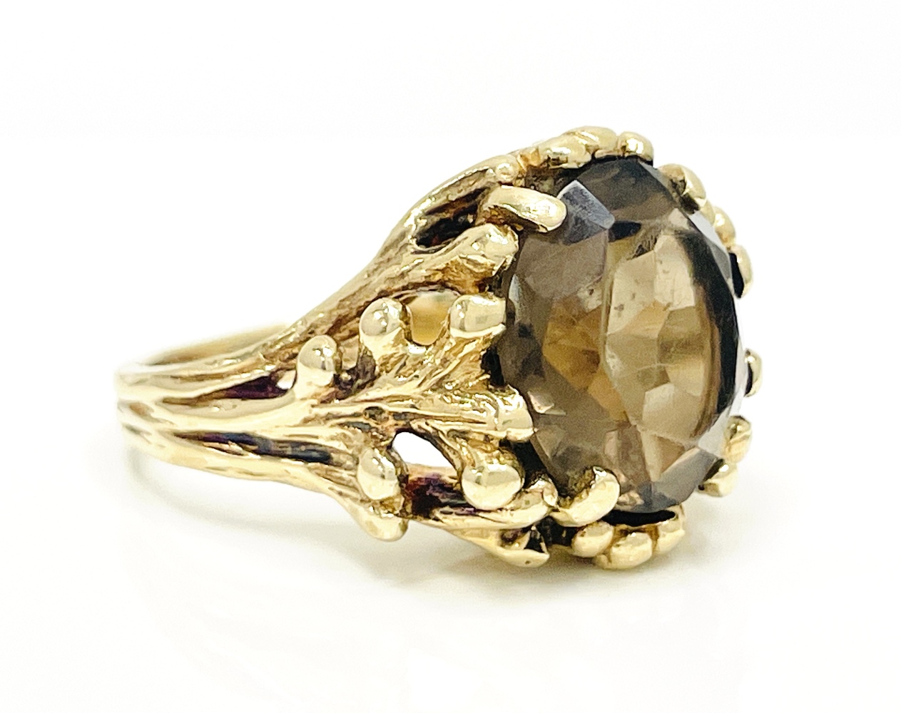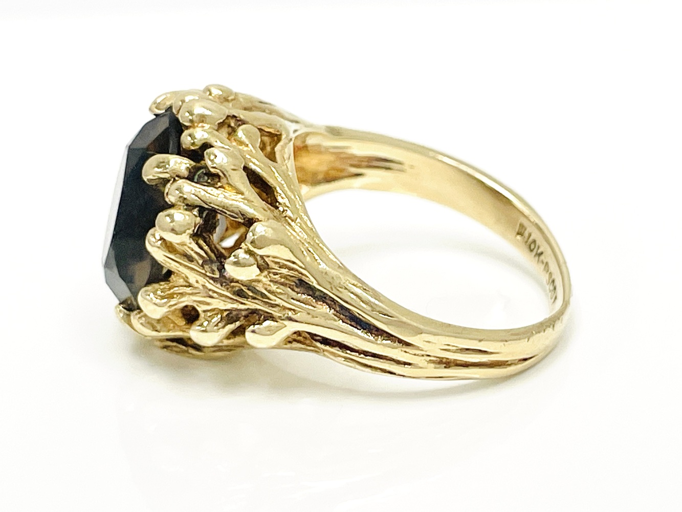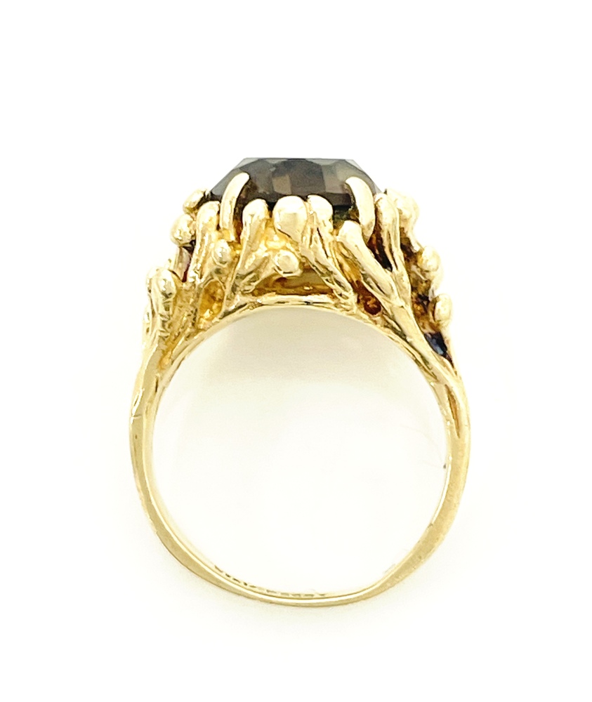 Experience the epitome of elegance with this exquisite 10K yellow gold ring, beautifully adorned with a captivating smokey quartz. The quartz statement stone measures a generous 12.5mm x11.5mm, adding a bold, regal touch to any ensemble. Housed in a size 6 set, this stunning piece is a limited edition, signifying a unique expression of style and sophistication.