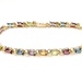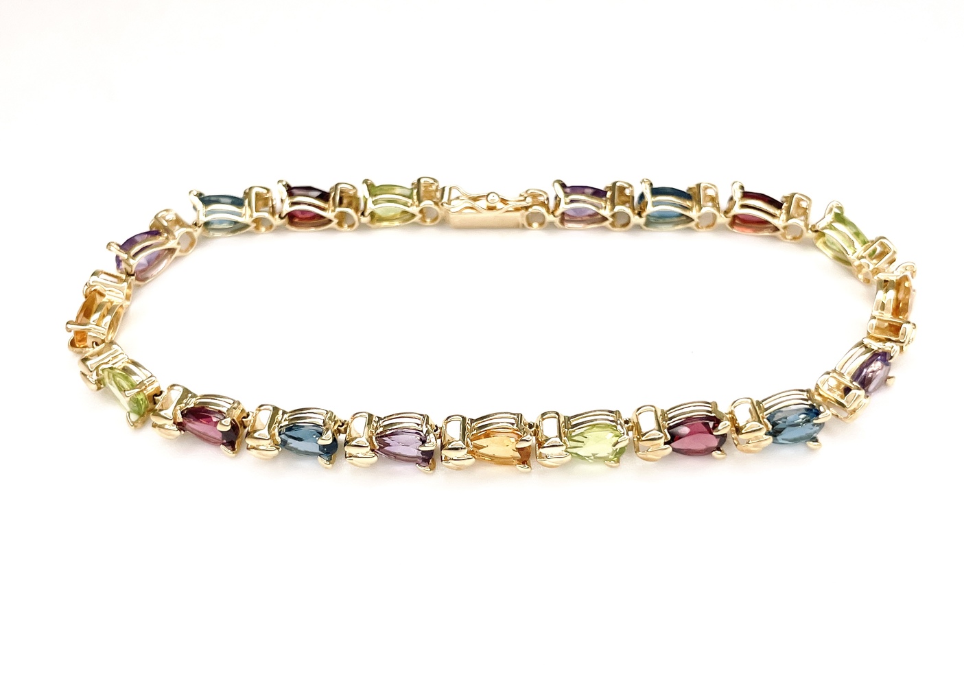 Astoundingly exquisite 14kt Yellow Gold Tennis Bracelet, elegantly styled with nineteen 7x5mm pear shaped multi-color gemstones. Decorated with Amethysts, Blue Topaz, Garnet, Peridot, and Citrine, this bracelet radiates vibrant hues and rich elegance. Measuring 7.5 in length, it is a testament to pure mastery in jewelry design. A splendid ornament that delicately wraps around and effortlessly enhances sophistication. This radiant asset is a perfect emblem of luxury.