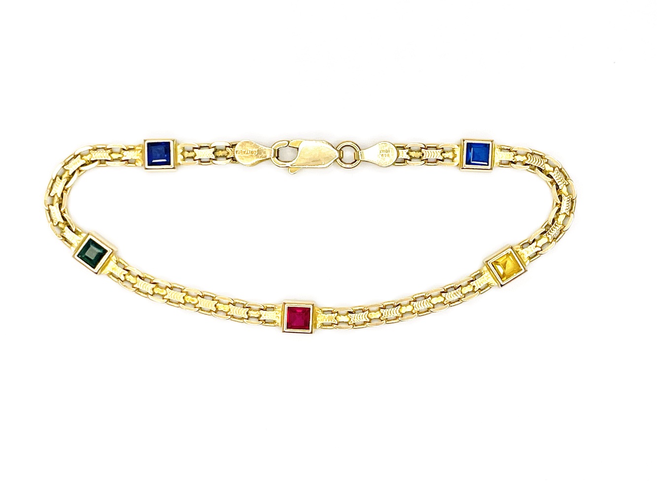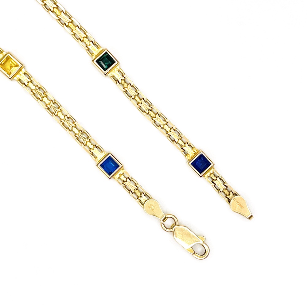 Experience luxury on your wrist with this exquisitely crafted 14K Yellow Gold Bracelet. The 7.5" length ensures a comfortable fit while the vibrant, colored stones gleam with radiant splendor. A perfect balance of elegance and charm, this bracelet promises to add timeless allure to your collection. Indulge in the pure grandeur of gold that tells a story of sophistication and refined taste. Wear this stunner to dazzle immediately!