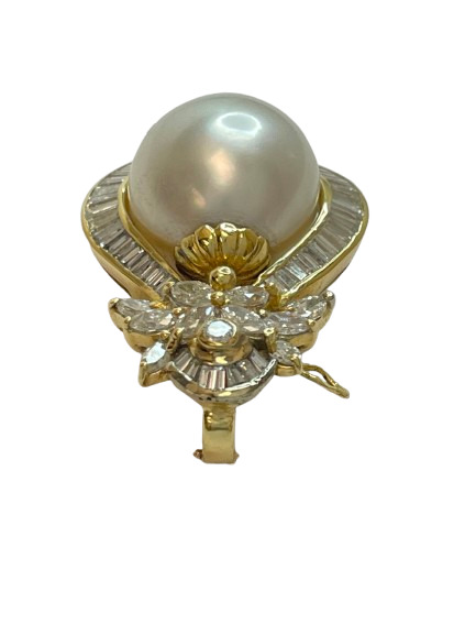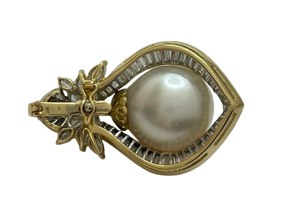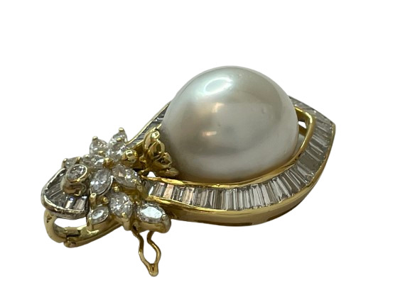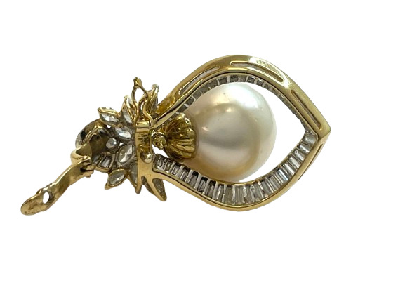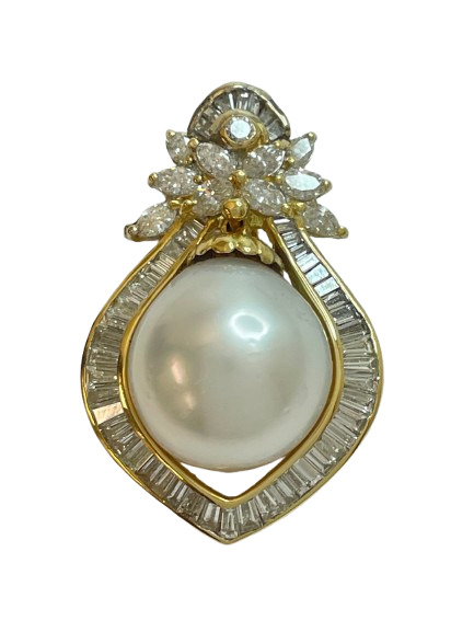 Radiate timeless elegance with this Opulent 18K Yellow Gold Diamond Pearl Pendant. A flawless, exquisite features a16mm pearl, sits at the center, surrounded by approximately 53 shimmering baguette diamonds, accented perfectly by 10 Marquise diamonds. Adding a final touch of sparkle with a single near-colorless round diamond, approximate 3.50 ctw SI-Near colorless natural diamonds.